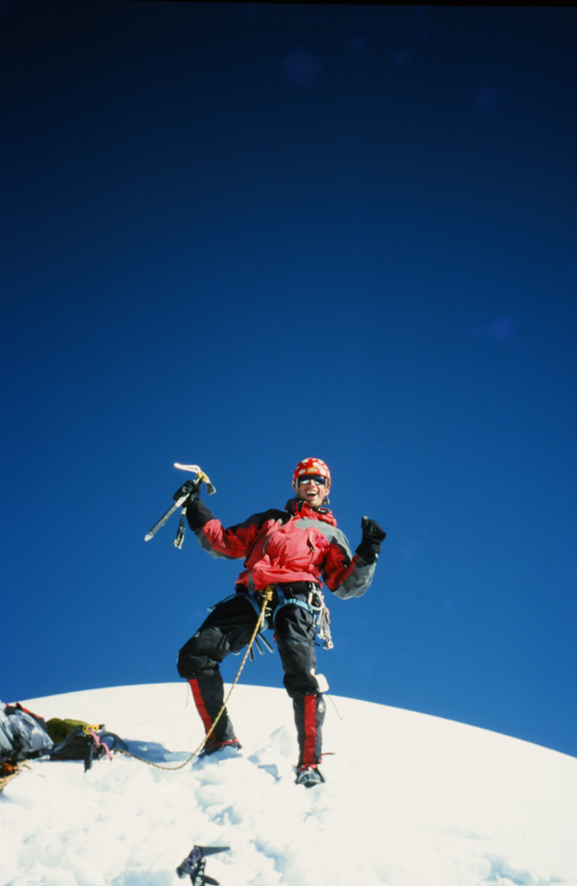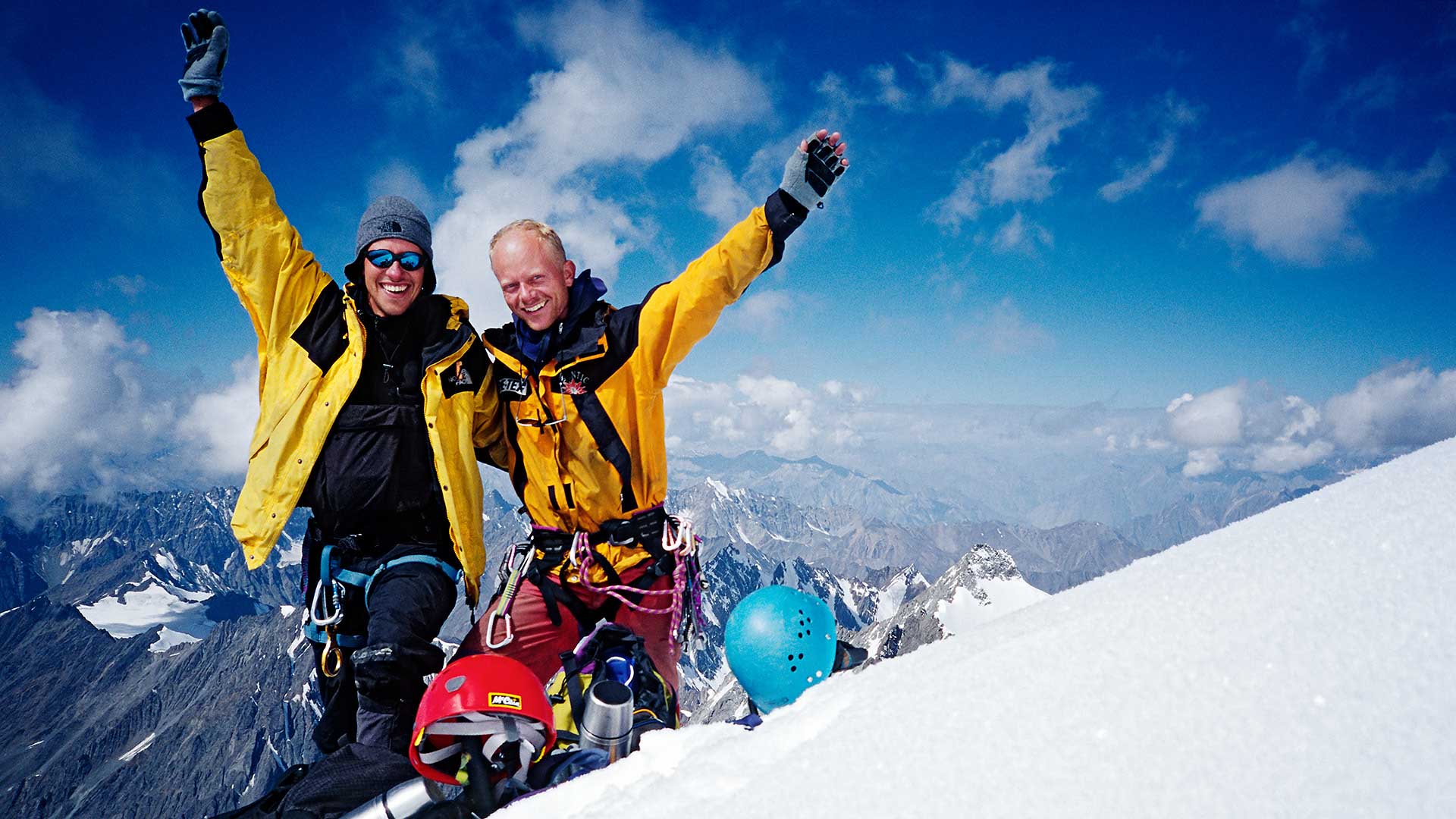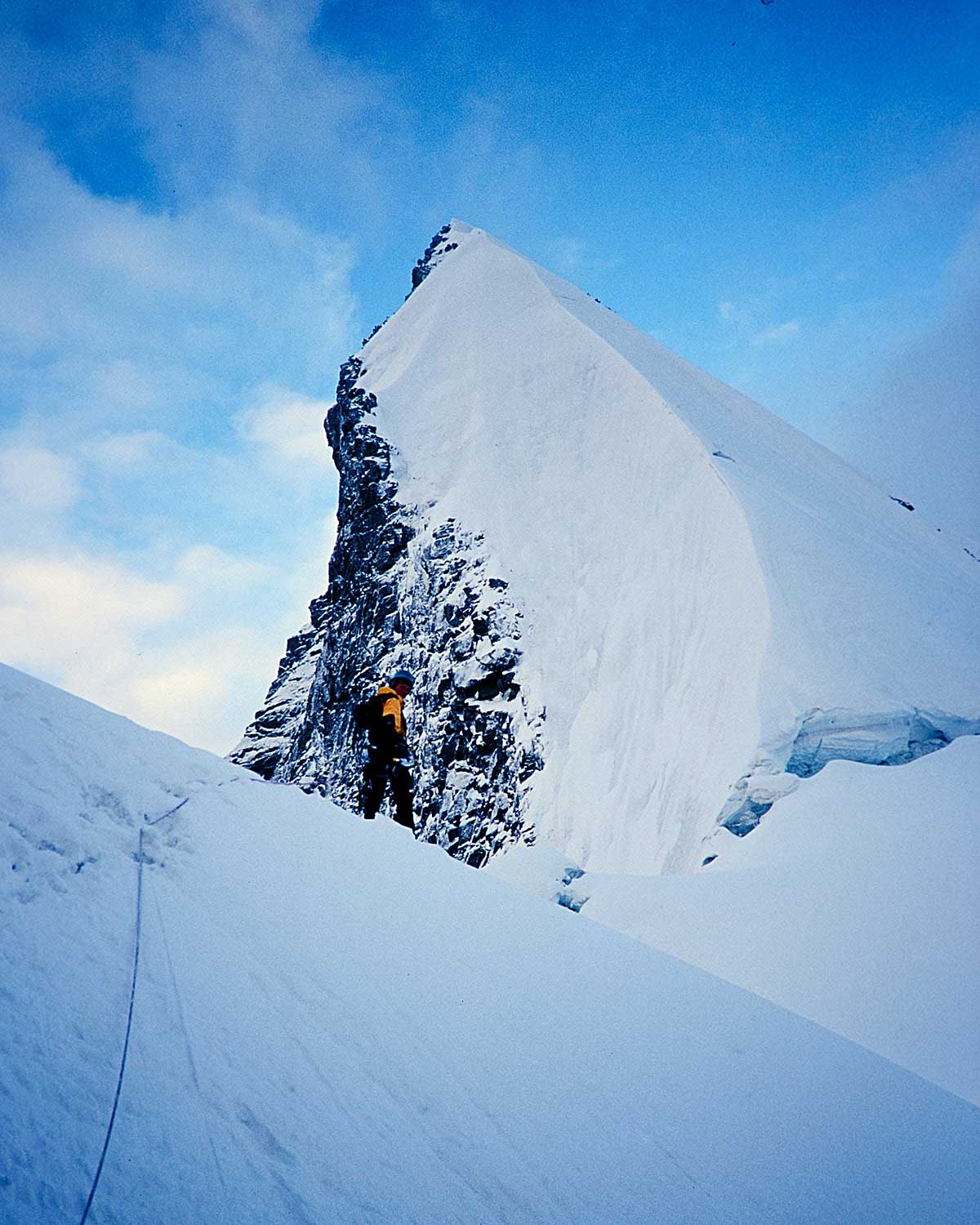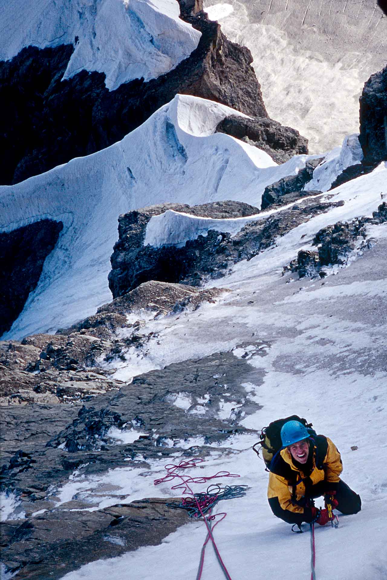 De route bleek aanhoudend moeilijk. Een lengte onder de uitklim was er nog een vertikaal ijsorgel, dat moest worden omzeild via een enigszins brakke rotsgordel. En meestal blijft de echte top dan plagerig verborgen achter de volgende hobbel. Maar in dit geval stuitten de mannen direct op de hoofdtop. De beklimming kostte Benno en Elwin in totaal 15 uur, in de tweede poging. De route werd meteen de volgende dag herhaald door Melvin en Andreas.
