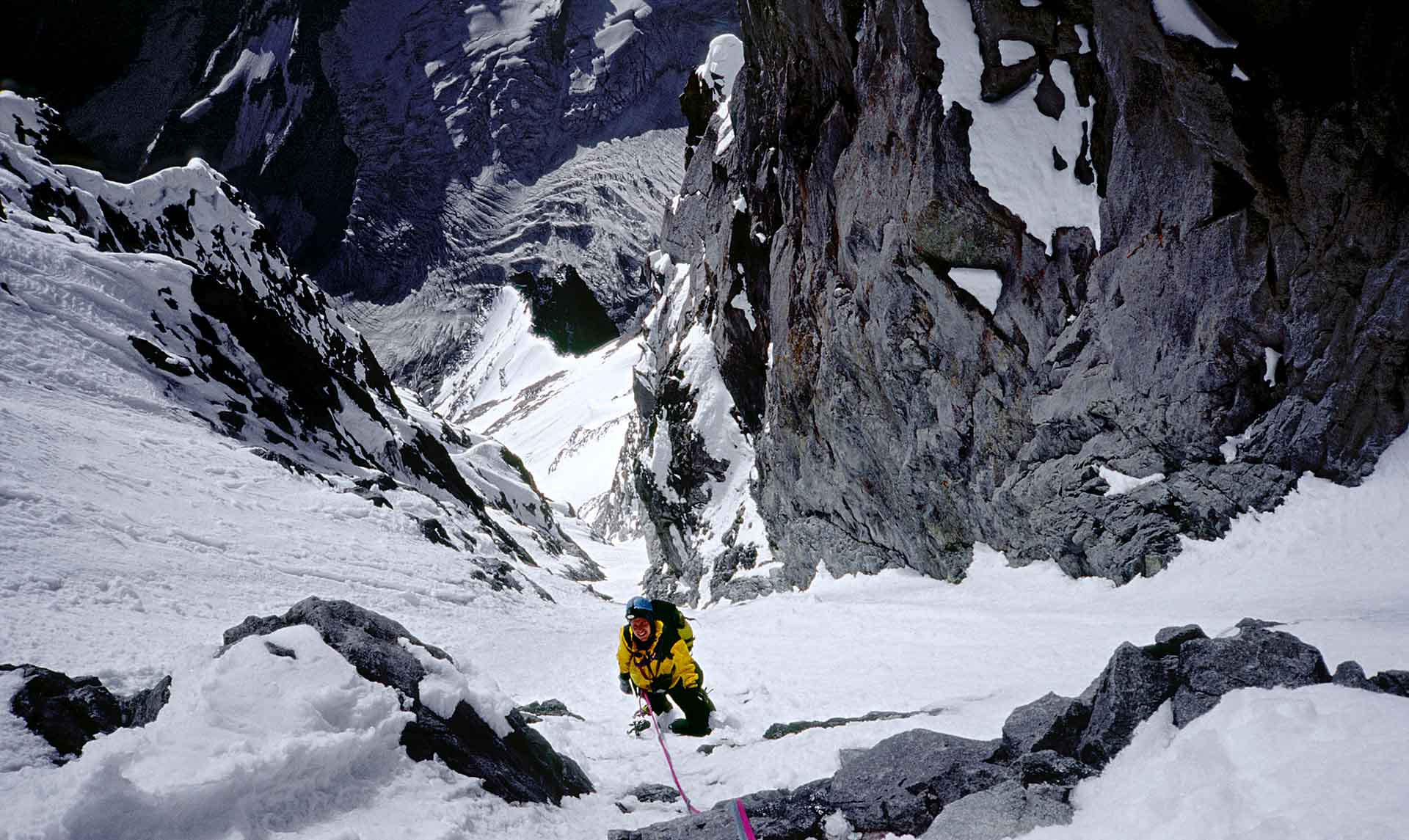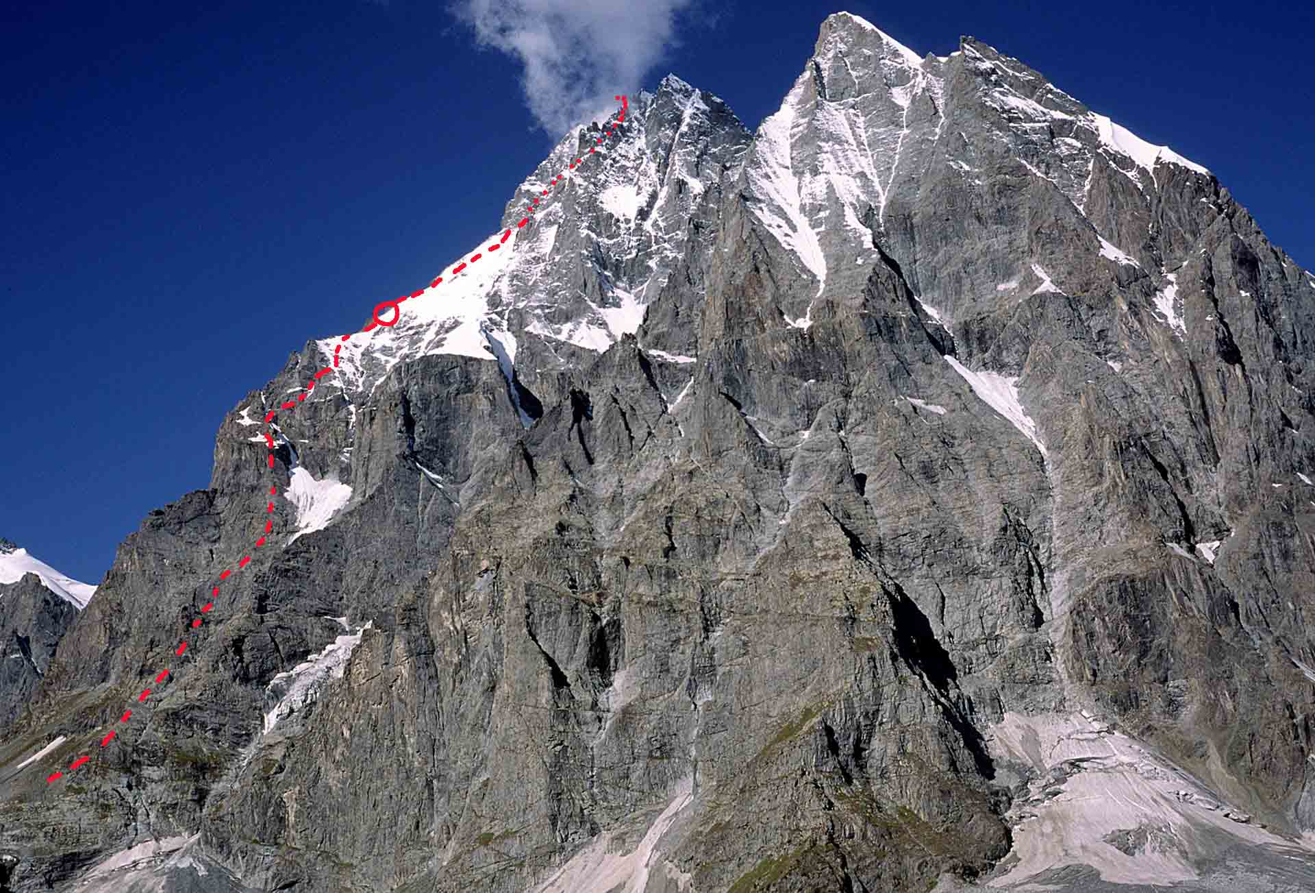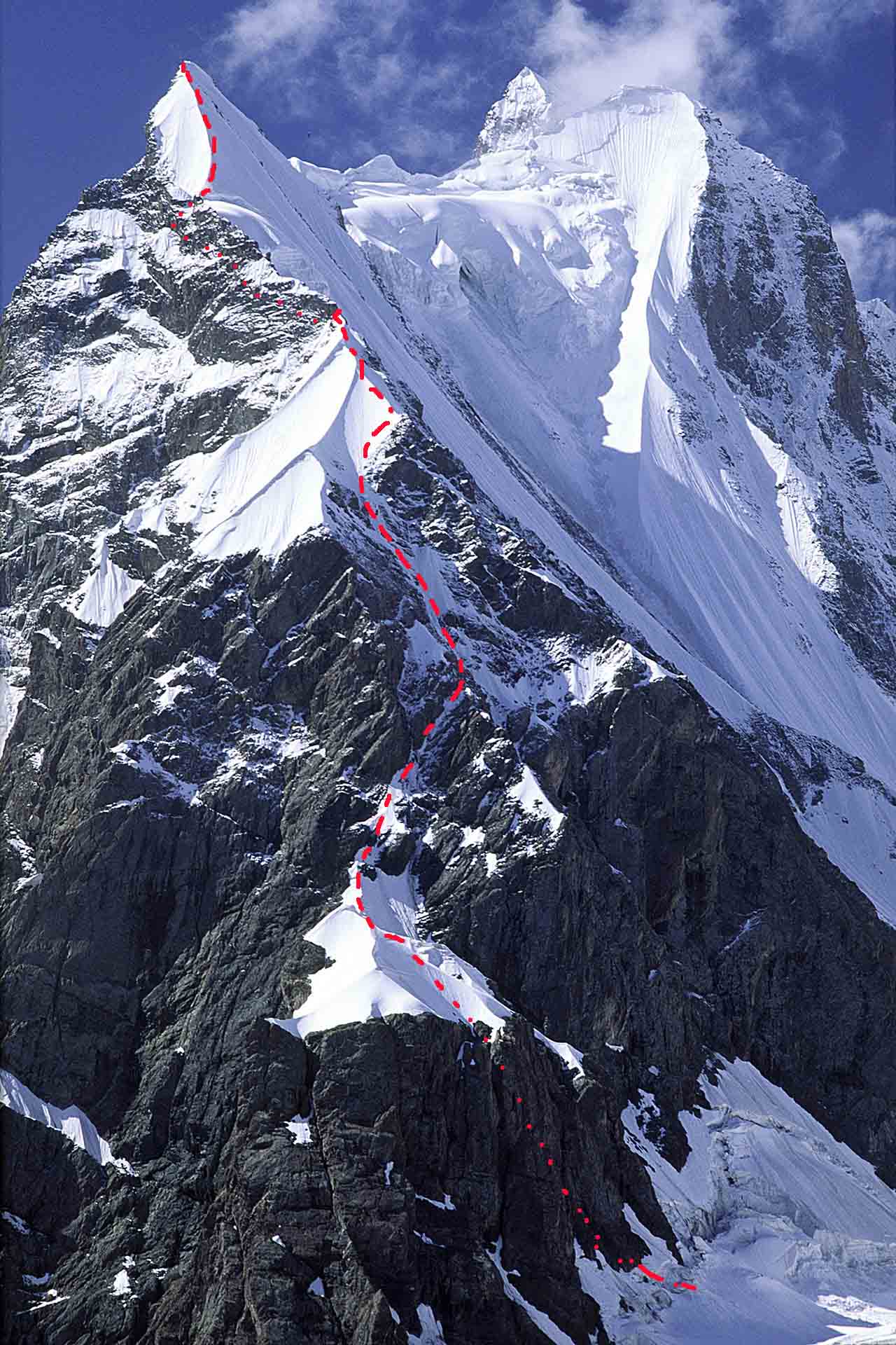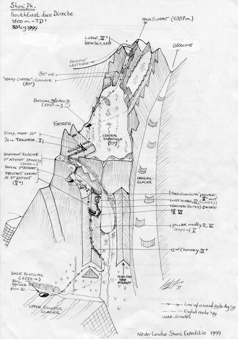 De beklimming van de Oost-top was dus gelukt, via de NO pijler door Melvin en Andreas. Maar een nieuwe lijn door de ZuidOost wand, direct onder de hoofdtop, moest de kroon op de trip zetten.De uitdaging was om een lijn te vinden, die niet alleen beklimbaar moest zijn, maar ook zo veilig mogelijk was. Een Engels team had in 1989 al een route geklommen, via couloirs en sneeuwvelden. Elwin en Benno kozen een meer directe lijn door moeilijker gecombineerd terrein, die minder steenslag gevaarlijk moest zijn.