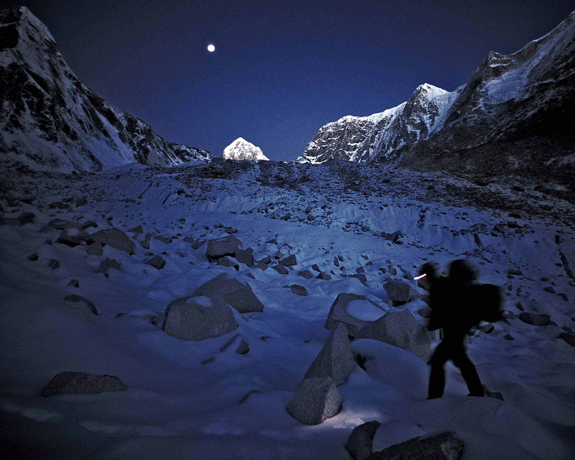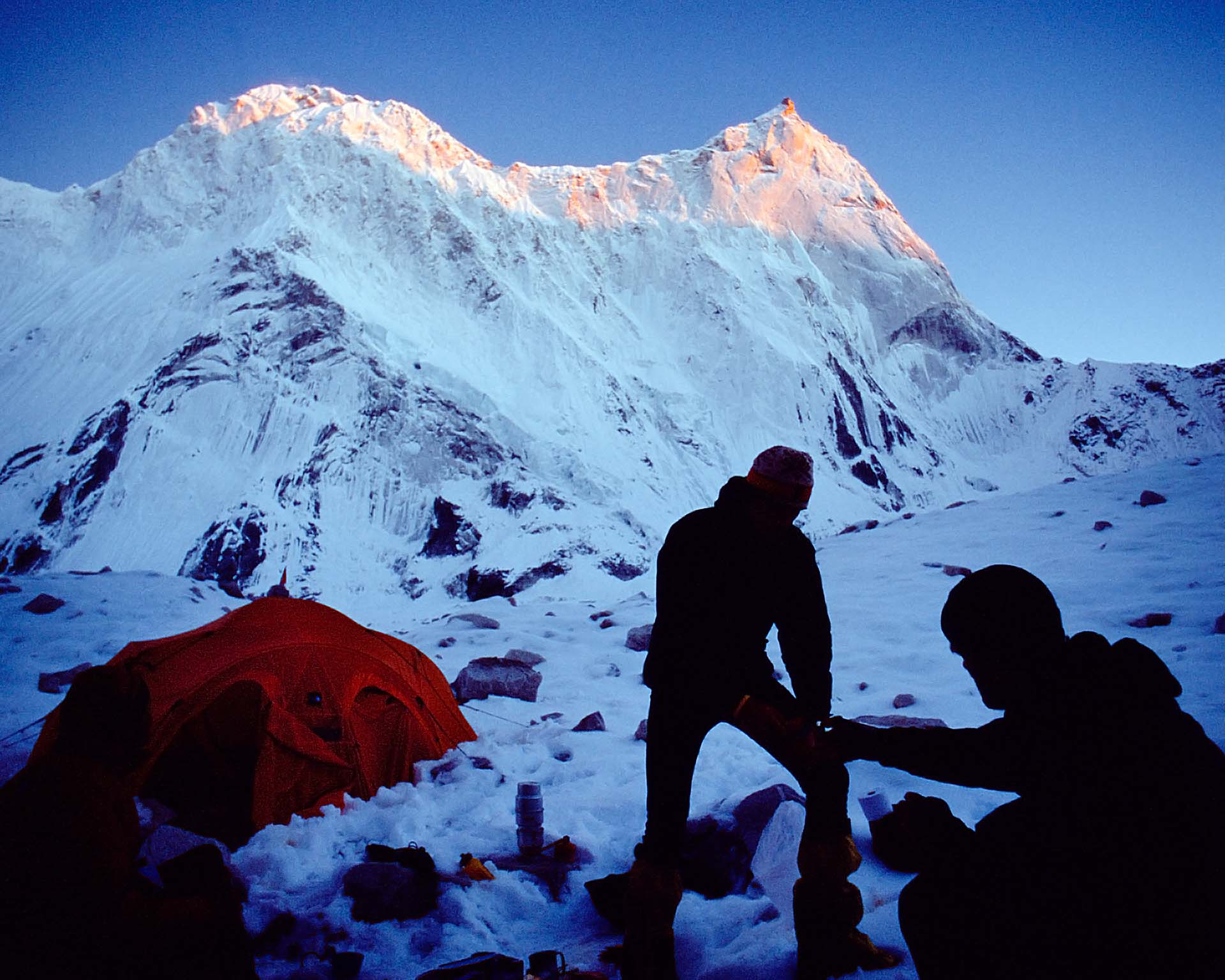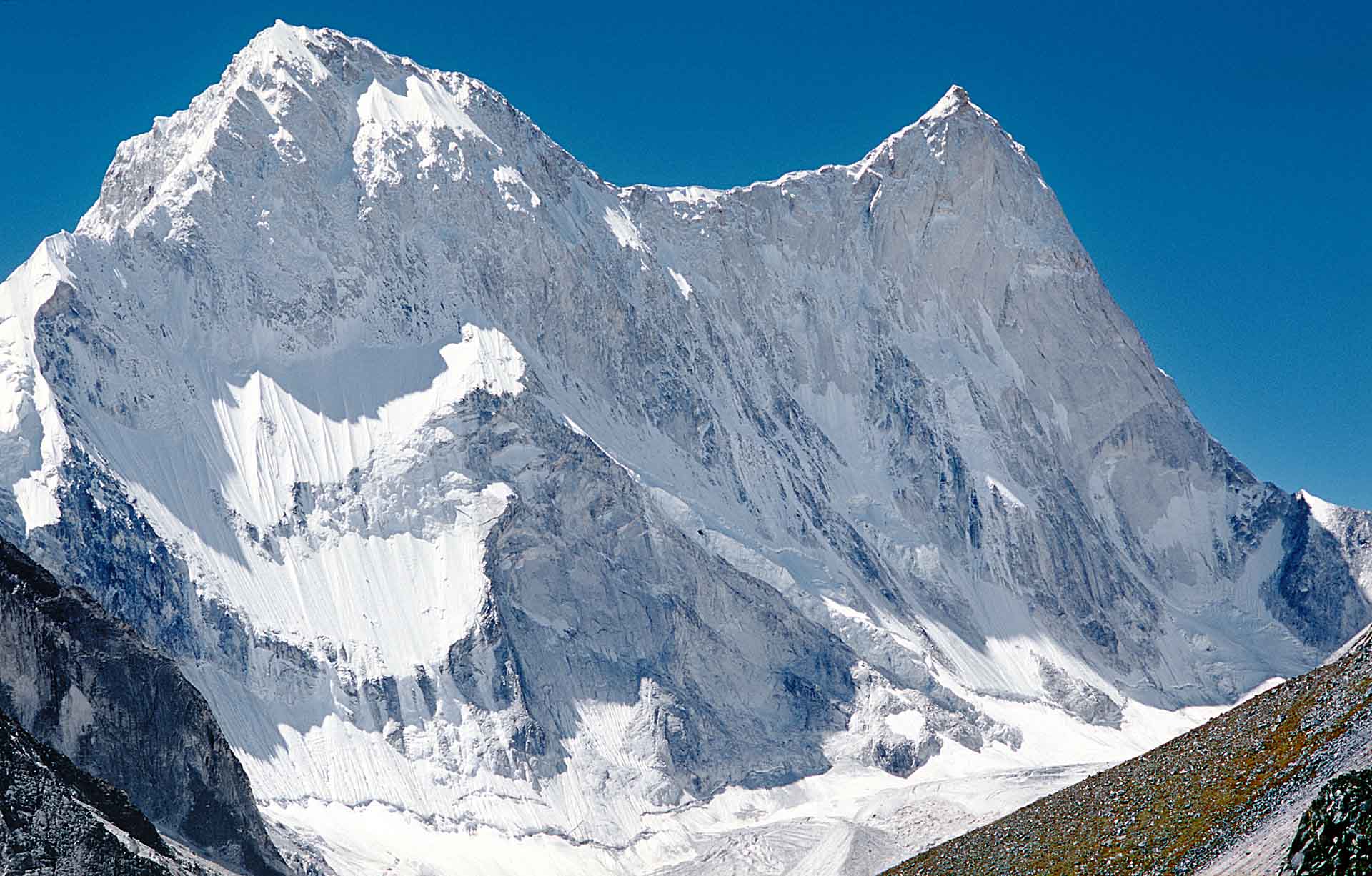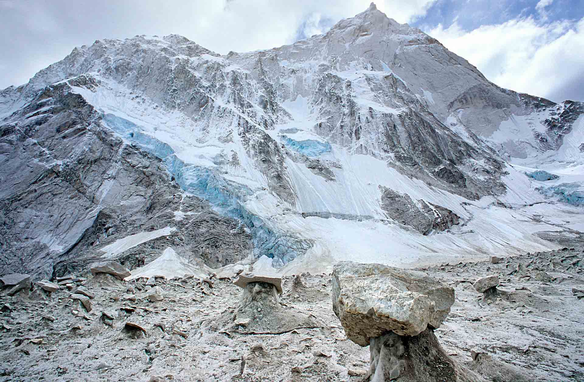 We lopen naar de noordwand van de Changabang. Op de gletsjer liggen prachtige steentafels. Mike en ik sjouwen met haulbags van zo’n 35 kilo. Onze beurse schouders vergeten we snel als we onder de wand staan. Eric Shipton noemde Changabang in 1936 'a vertical wall of rock whose smooth face was quite magnificent…' De meest passende omschrijving is van Frank Smythe, die in 1937 een poging deed de 7066 meter hoge Dunaagiri te beklimmen. 'A peak that falls from crest to glacier in a wall that might have been sliced in a single cut of knife.'