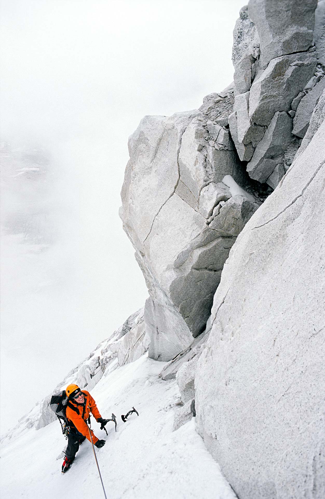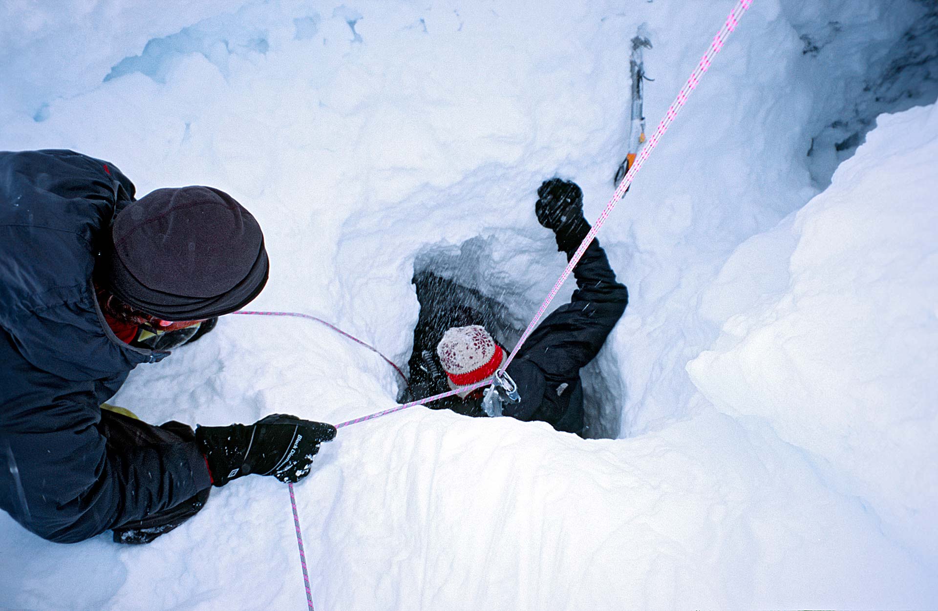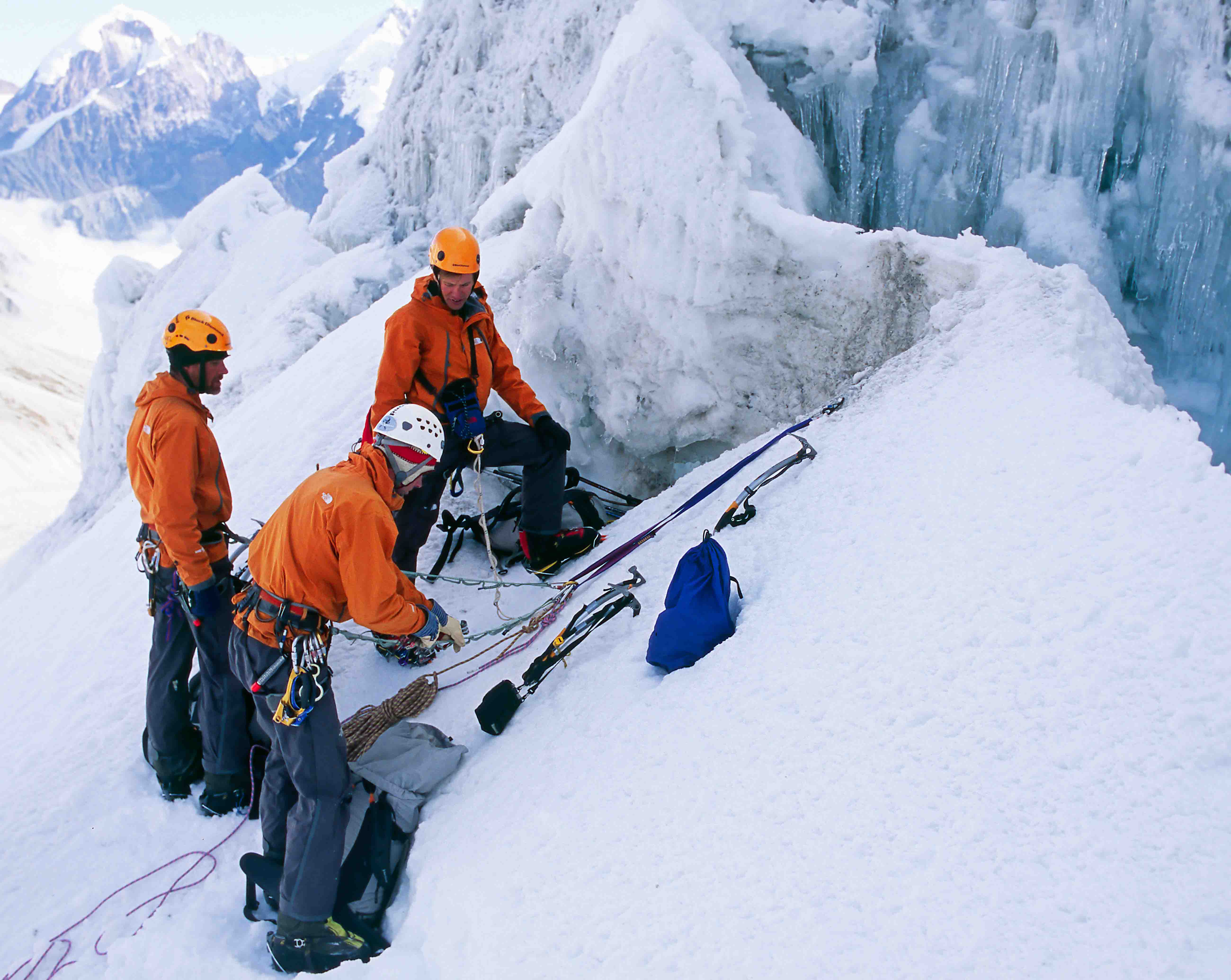 De taken zijn verdeeld; Andreas en ik fixen eerst het ijsveld, terwijl Cas en Mike klimmateriaal naar de wand slepen. Andreas maakt de abalakovs en zet de touwen vast, ik breng op de bovenste standplaats het materiaal op orde. Aan het eind van de ochtend betrekt het. Om een uur of één begint het te sneeuwen en draaien we om. Tijdens de steile abseil over de randspleet verdwijnt Andreas in een wolk spindrift. De volgende dag zijn de rollen omgedraaid. Cas en Mike mogen dan de eerste mooie lengtes van het couloir klimmen.