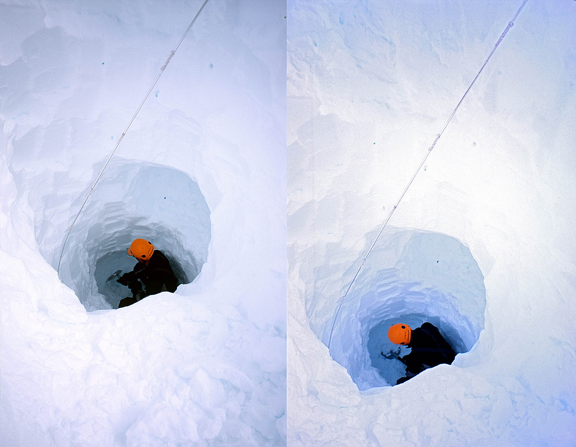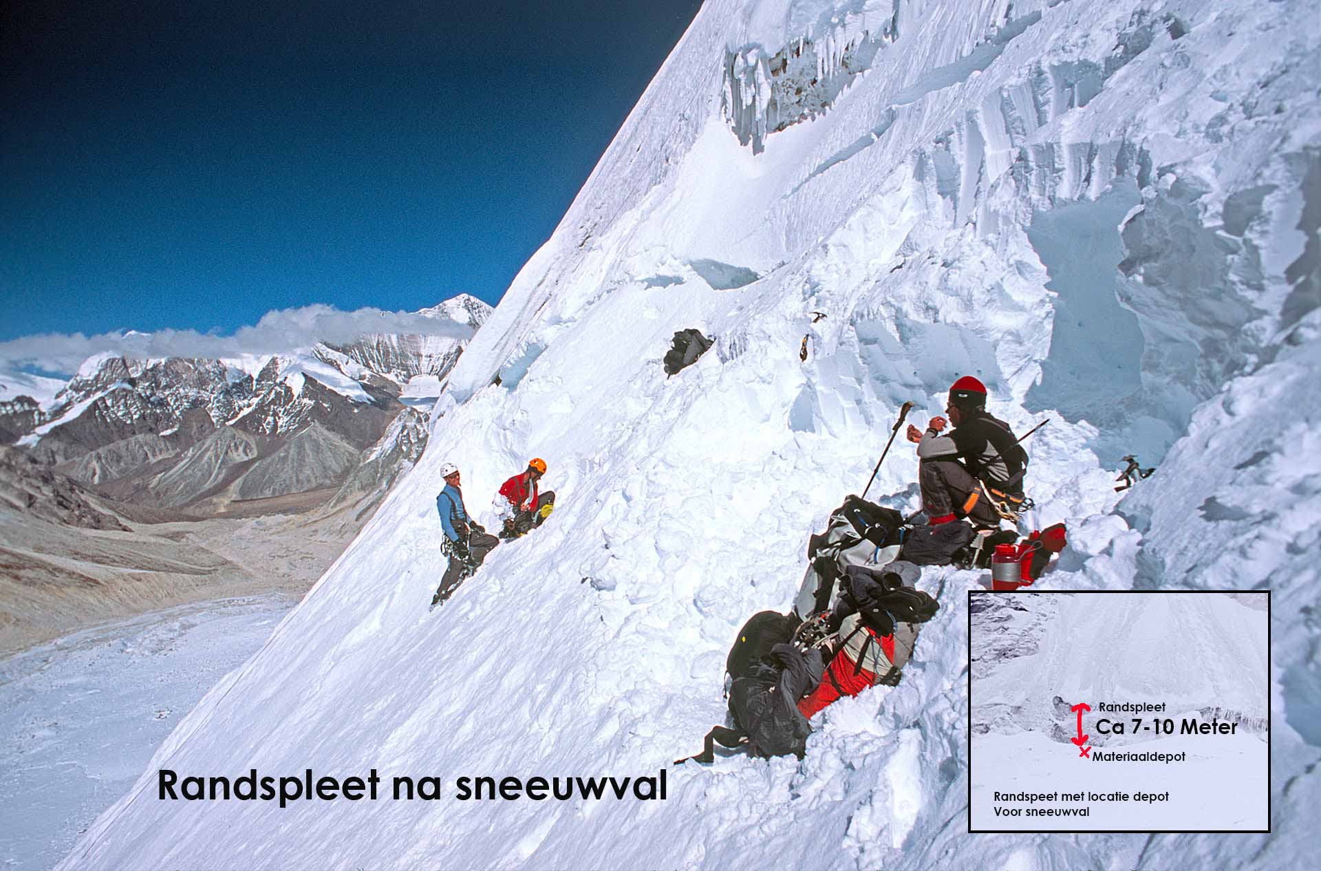 Na zeven dagen regen een sneeuw schijnt de zon weer. In gedachten zien we onszelf al naar de top klimmen. Als we na anderhalve dag lopen bij de randspleet aankomen herkennen we het terrein niet meer terug. De tien meter hoge ijswand van de randspleet is verdwenen onder een pak sneeuw. We maken een inschatting waar me moeten graven n gaan aan de slag. We volgen het touw dat vanaf het ijsveld naar het materiaaldepot leidt. We graven tot zeven meter diepe gangen. Met een vier meter lange tentstok sonderen we de helling. Een week lang heeft het gesneeuwd, zijn er lawines over deze helling geraasd. “Er ligt minimaal tien meter sneeuw”, concluderen we. Zelfs de hellingshoek van de sneeuwflank onder de randspleet is veranderd. Als we precies op de juiste plek graven, moeten we minimaal tien kuub sneeuw verplaatsen. Het touw loopt diagonaal door de helling. We zijn kansloos.