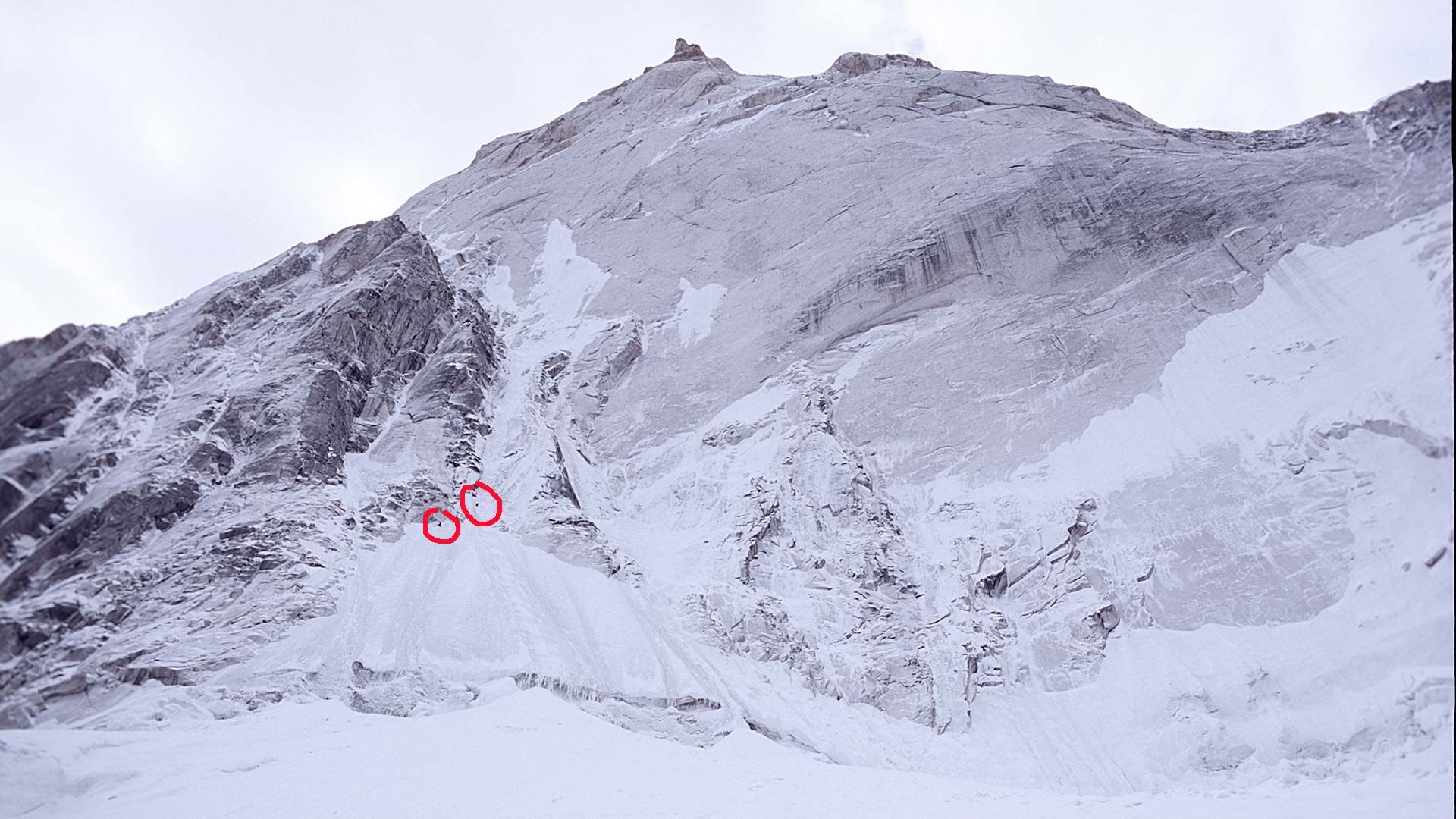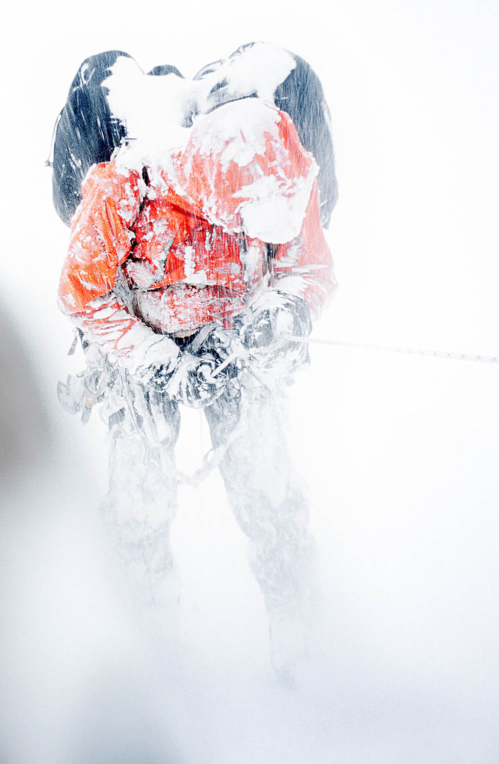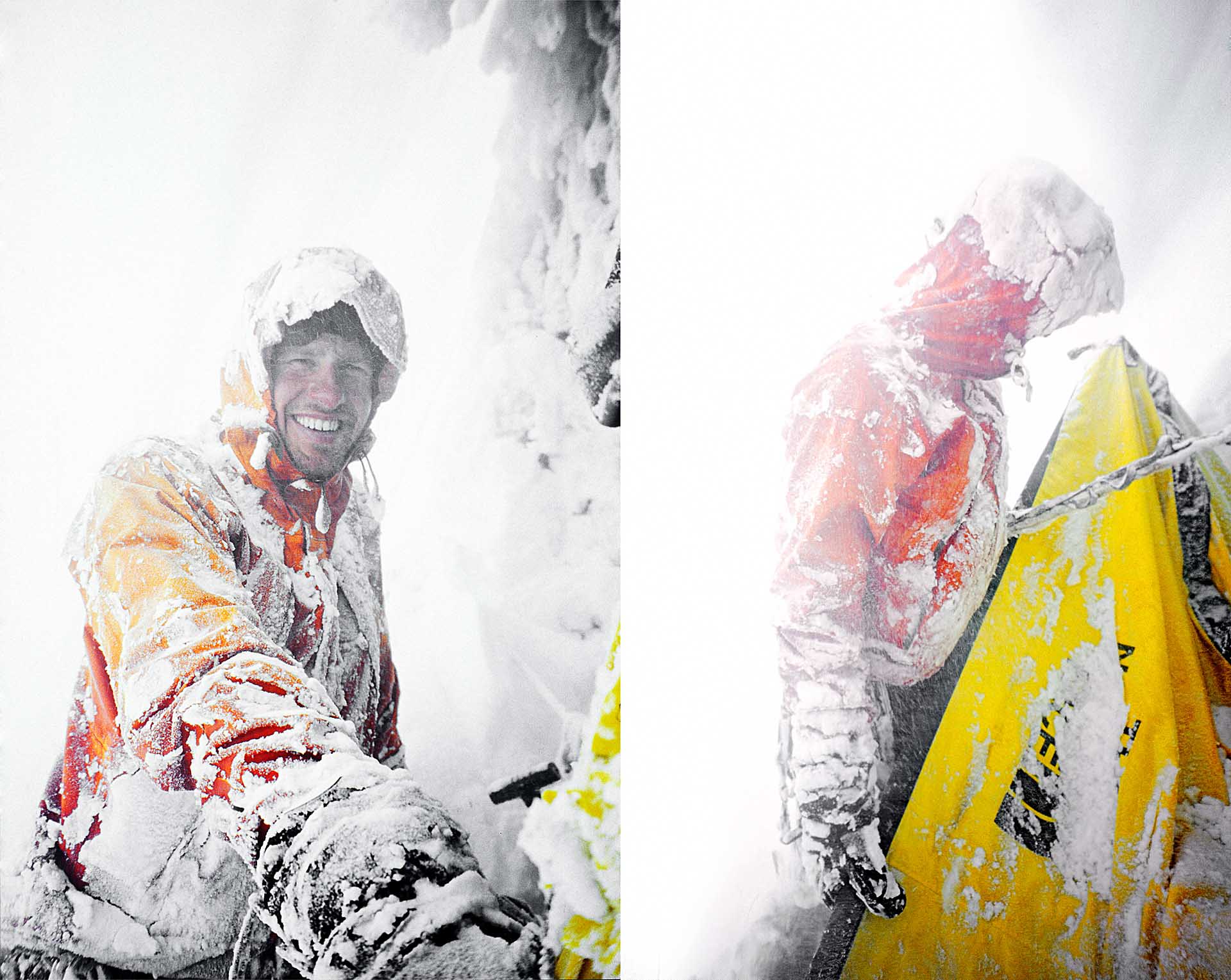 Tijdens het ophangen van de portaledge begint het te sneeuwen. De 1600 meter hoge granieten wand van de Changabang vormt een soort trechter en wij staan daar direct onder. Rivieren van sneeuw stromen uit de wand. De grens tussen spindrift en lawines vervaagt. Om te voorkomen dat de sneeuw ons die nacht volledig bedelft gaan we er regelmatig uit om de portaledge uit te graven. “Jongens, kom maar snel naar beneden en neem de portaledge mee. Dit zou wel eens het eind van de expeditie kunnen zijn,” roept Mike ’s ochtends door de radio. “Laat even weten wanneer jullie afdalen, dan proberen we jullie te volgen.” Buiten de portaledge zien Andreas en ik hoeveel sneeuw er valt. We horen grote lawines, soms akelig dichtbij. Door de mist kunnen we ze niet zien. Ik zoek radiocontact: “Mike en Cas, de pleuris is hier uitgebroken! We moeten zo snel mogelijk weg hier! We kunnen de portaledge niet meenemen!” “Oké, doe dat dan maar,” antwoordt Mike. Radiostilte. We sporen heupdiep door de sneeuw. Met een zachte ‘whoeemm’ trekt er een centimeter brede scheur in het sneeuwdek. “Traverseer naar de minst steile flank!” roep ik. Een paar minuten later raast er voor ons een grote lawine naar beneden. Andreas: “Dat is wel erg dichtbij!” Over deze lawinekegel bereiken we, veel lager, de veilige helling. Cas, Mike en de Engelse klimmer Olly sporen ons tegemoet.