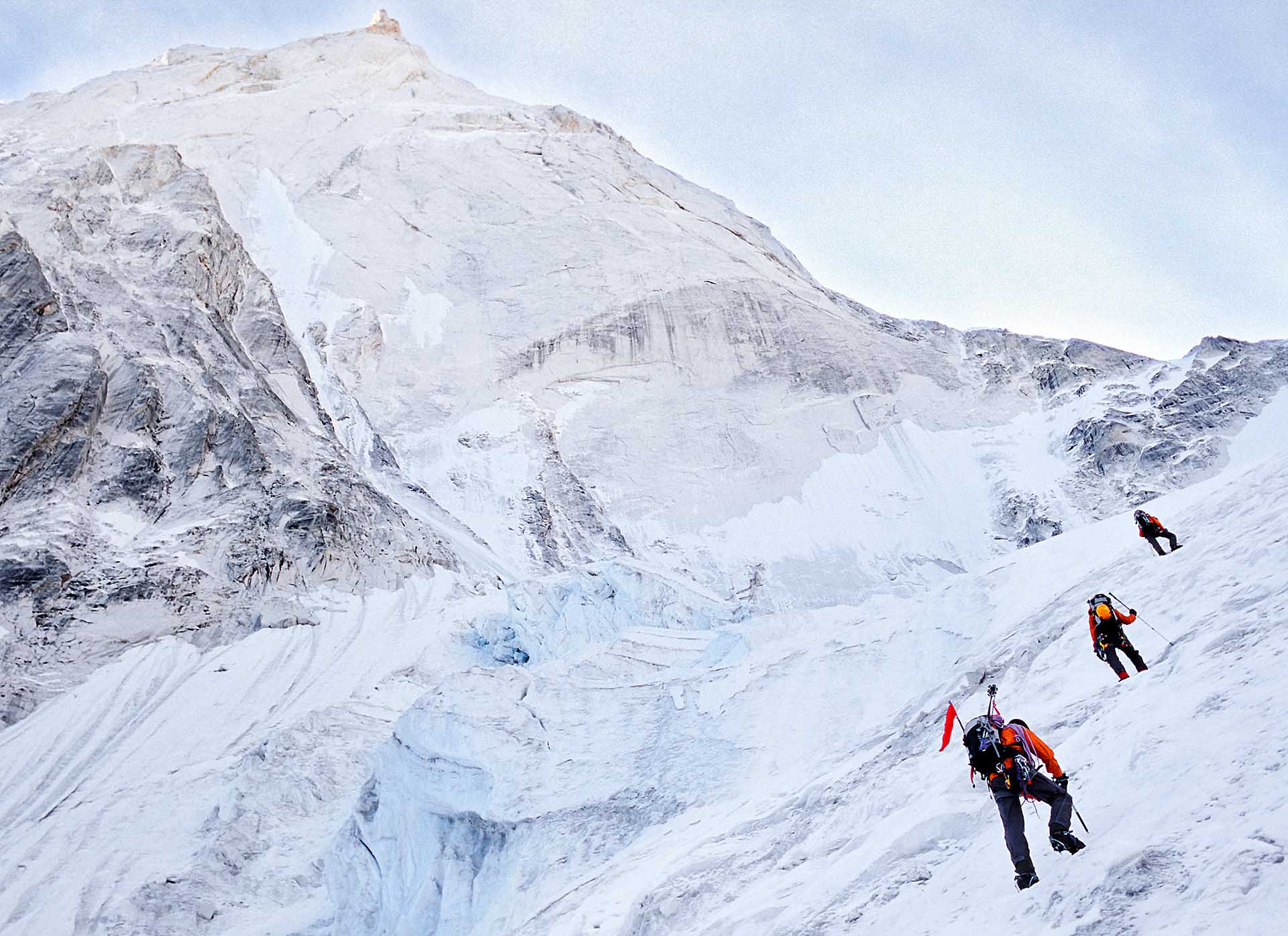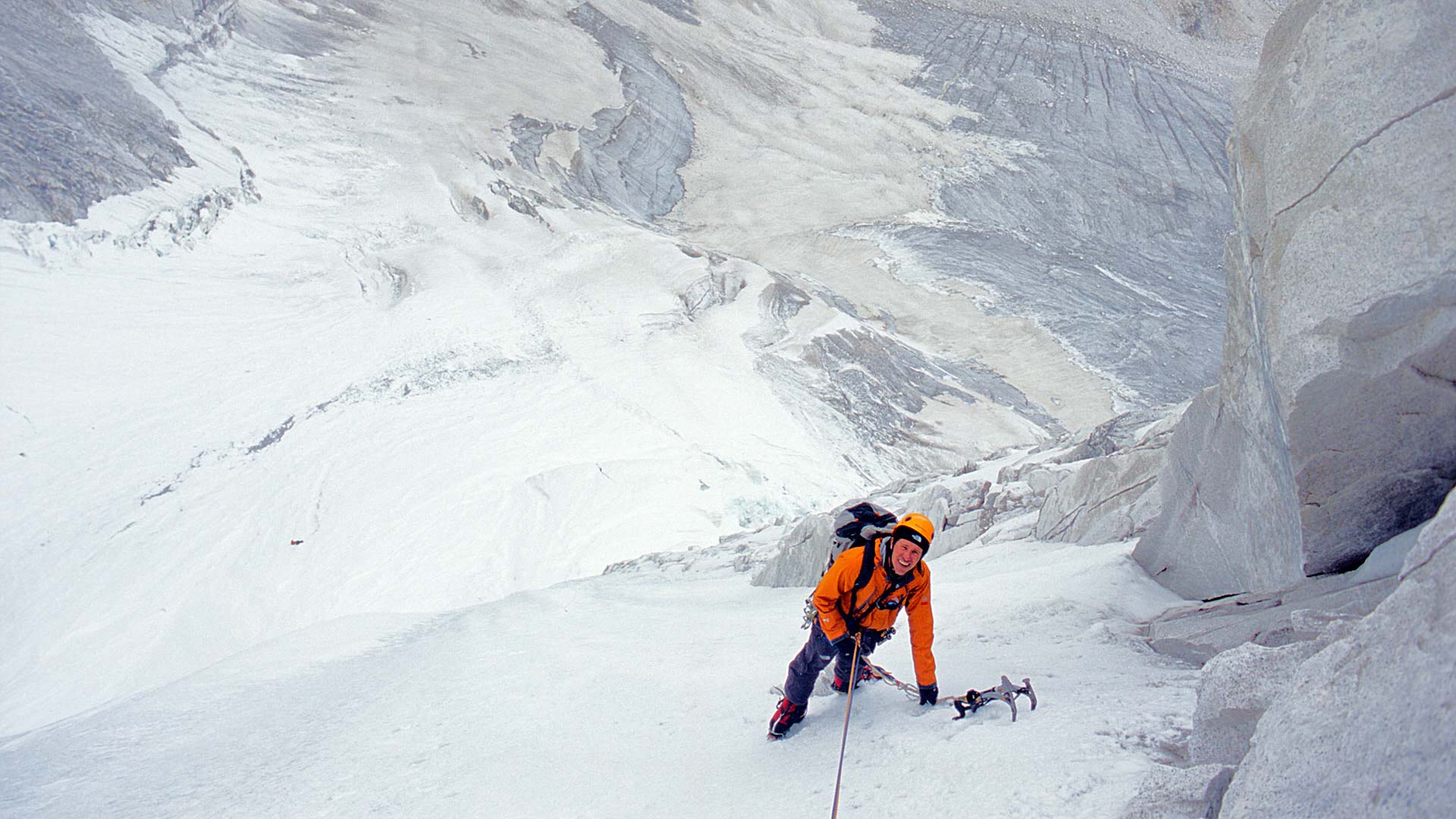 Het aanzicht is inderdaad ‘tamelijk indrukwekkend’. Een granieten plaat rijst 1600 meter hoog voor ons op. Overhangend aan de voet, loodrecht in het midden en overhangend naar de top toe. Maar goed dat wij, naast bergbeklimmen, niet aan basejumpen doen. Nog nooit zag ik zo’n steile Himalayawand. Hoger op de gletsjer staan we alle vier aan het ijs genageld: een vet couloir markeert de overgang tussen de yosemity-achtige granietwand en de met ijs bepleisterde voorbouw. De lijn ziet er fantastisch uit. We hebben onze route gevonden!
