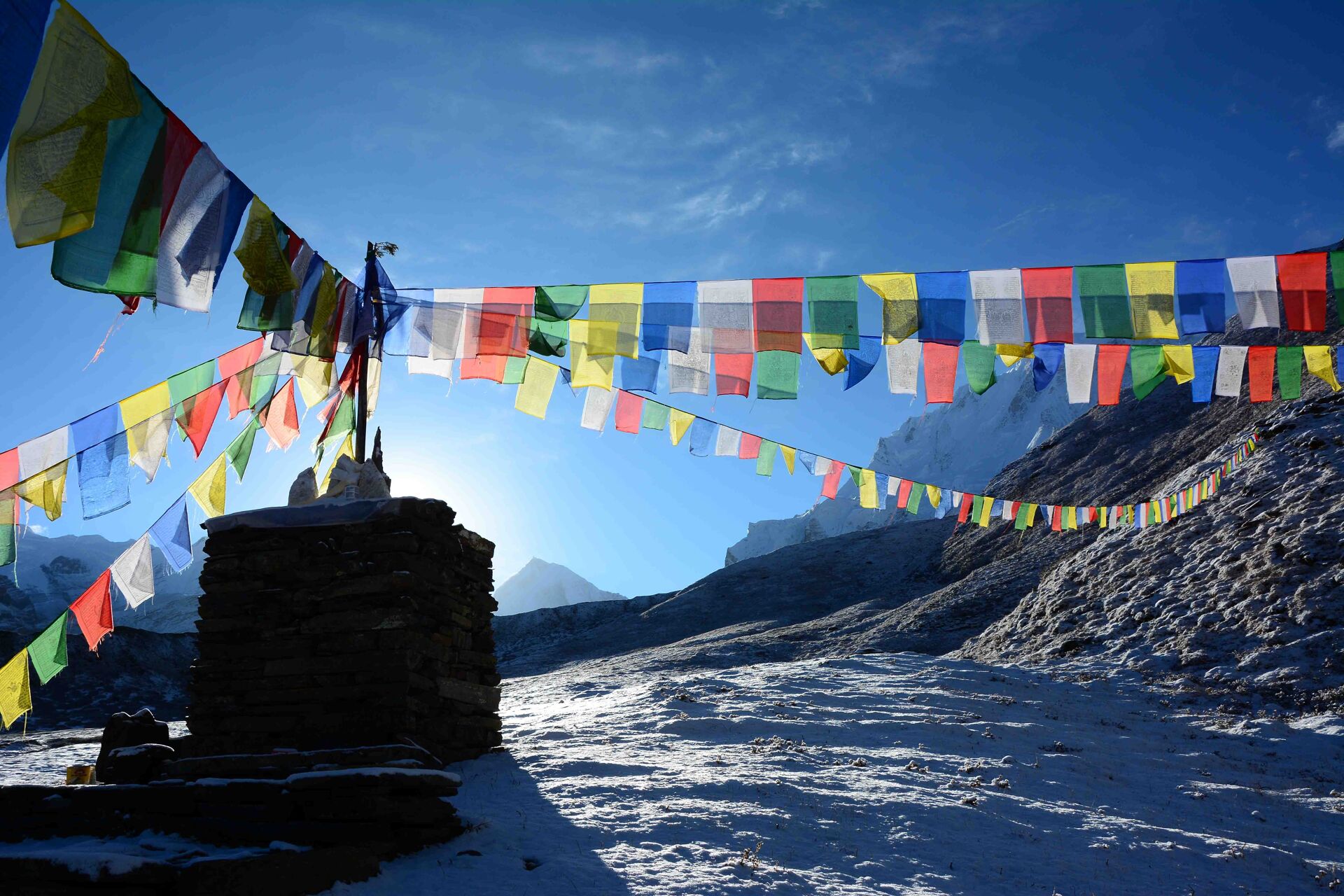 Gebedsvlaggetjes bij de start van de expeditie.
