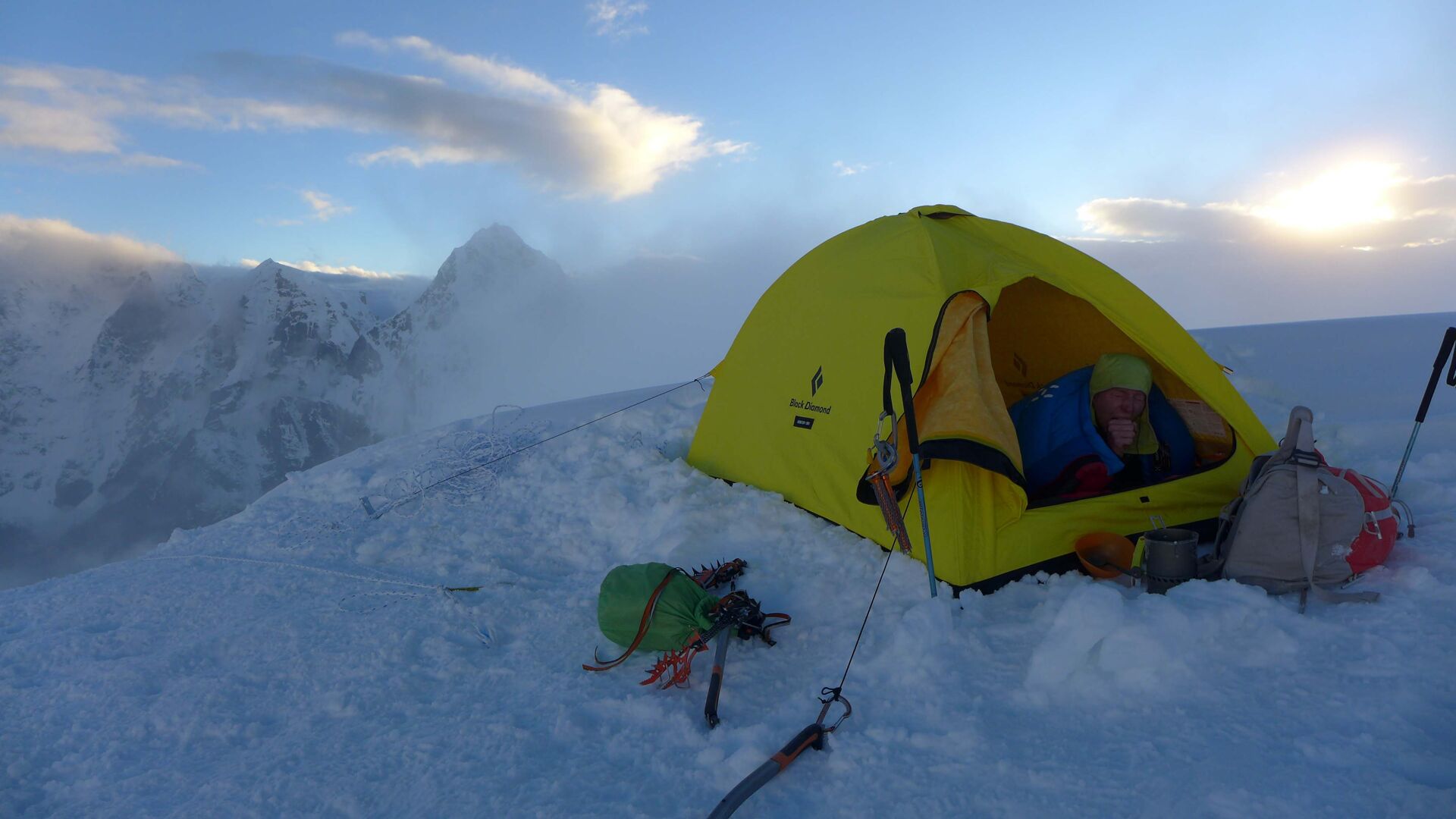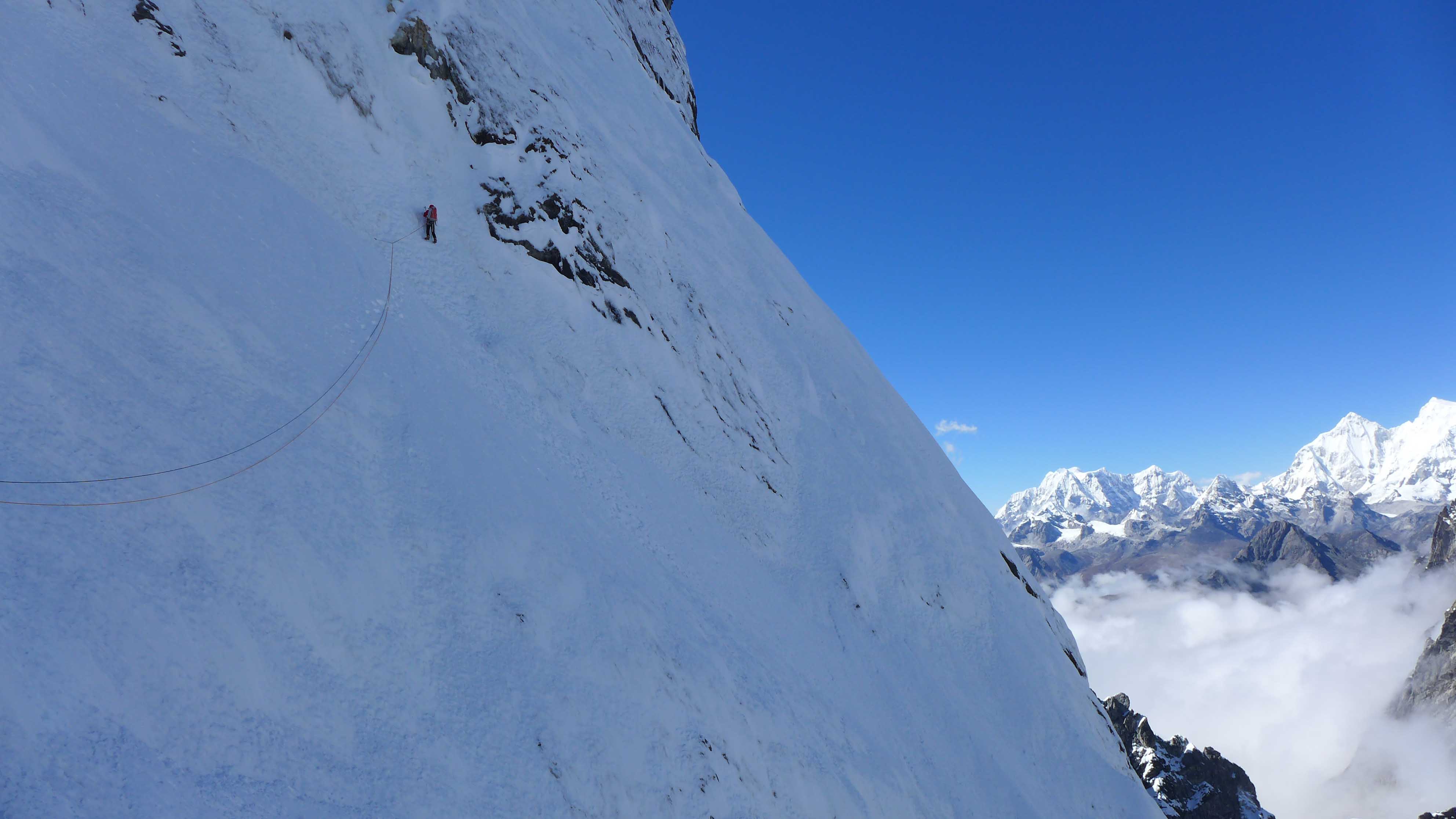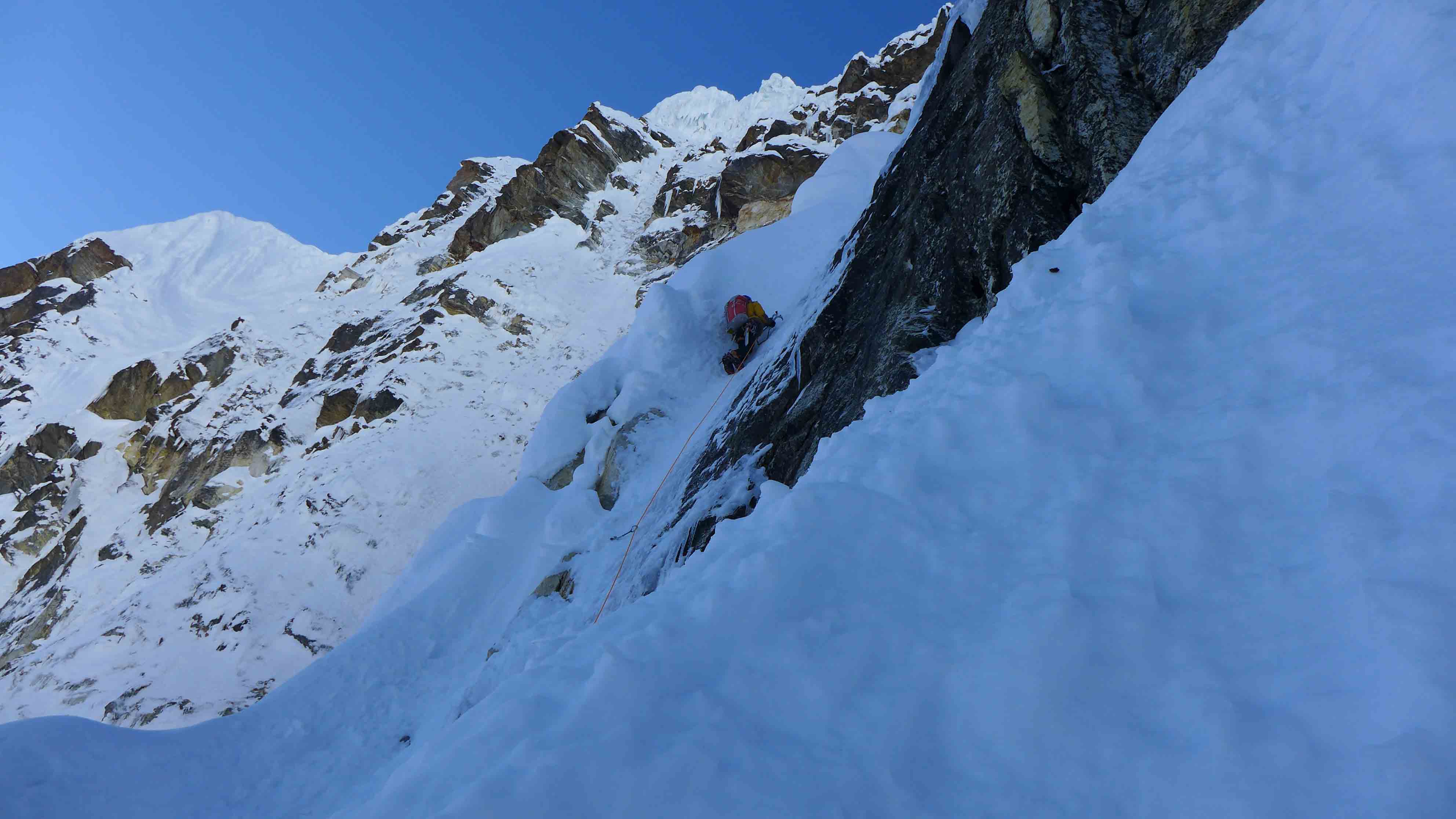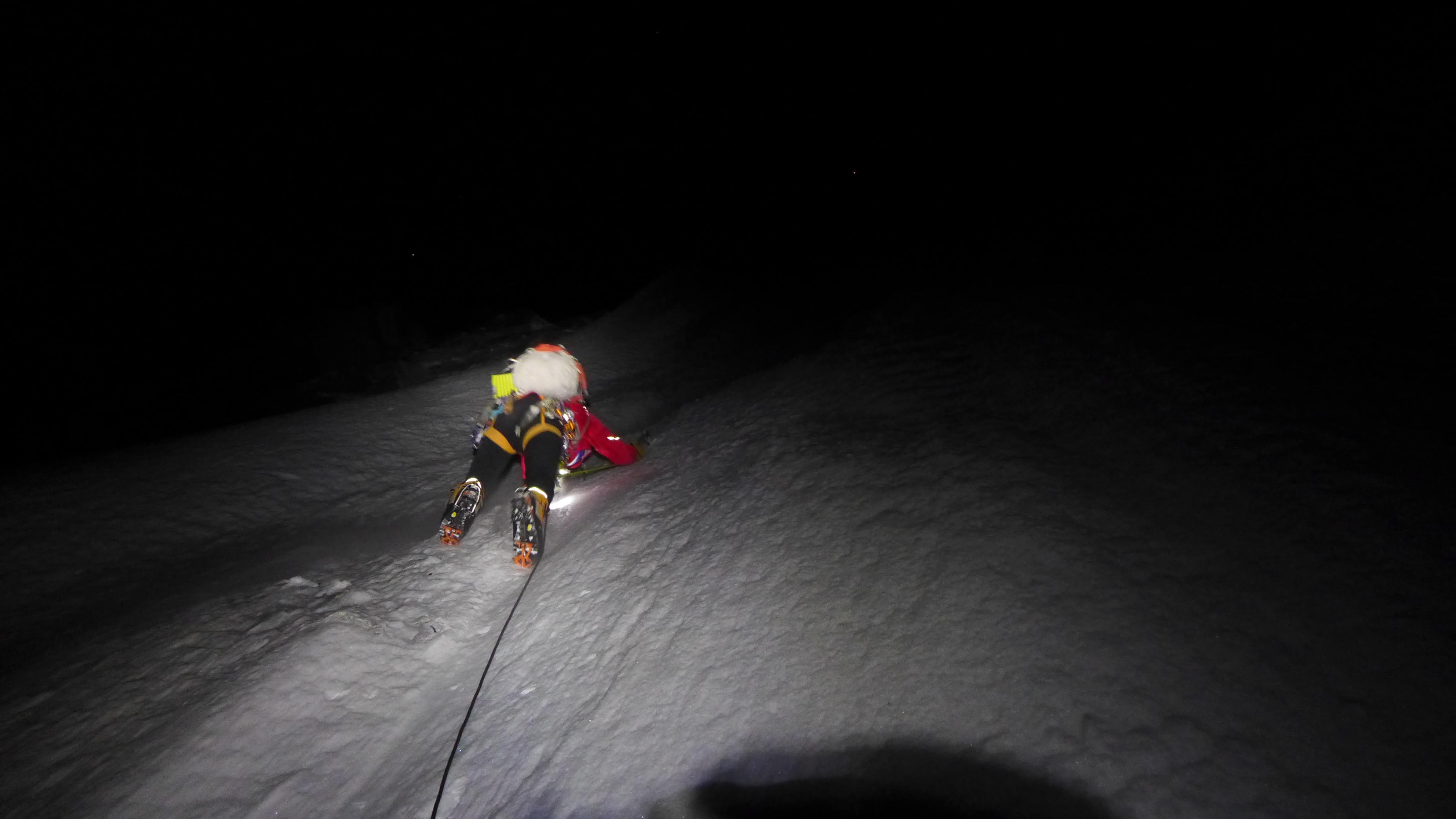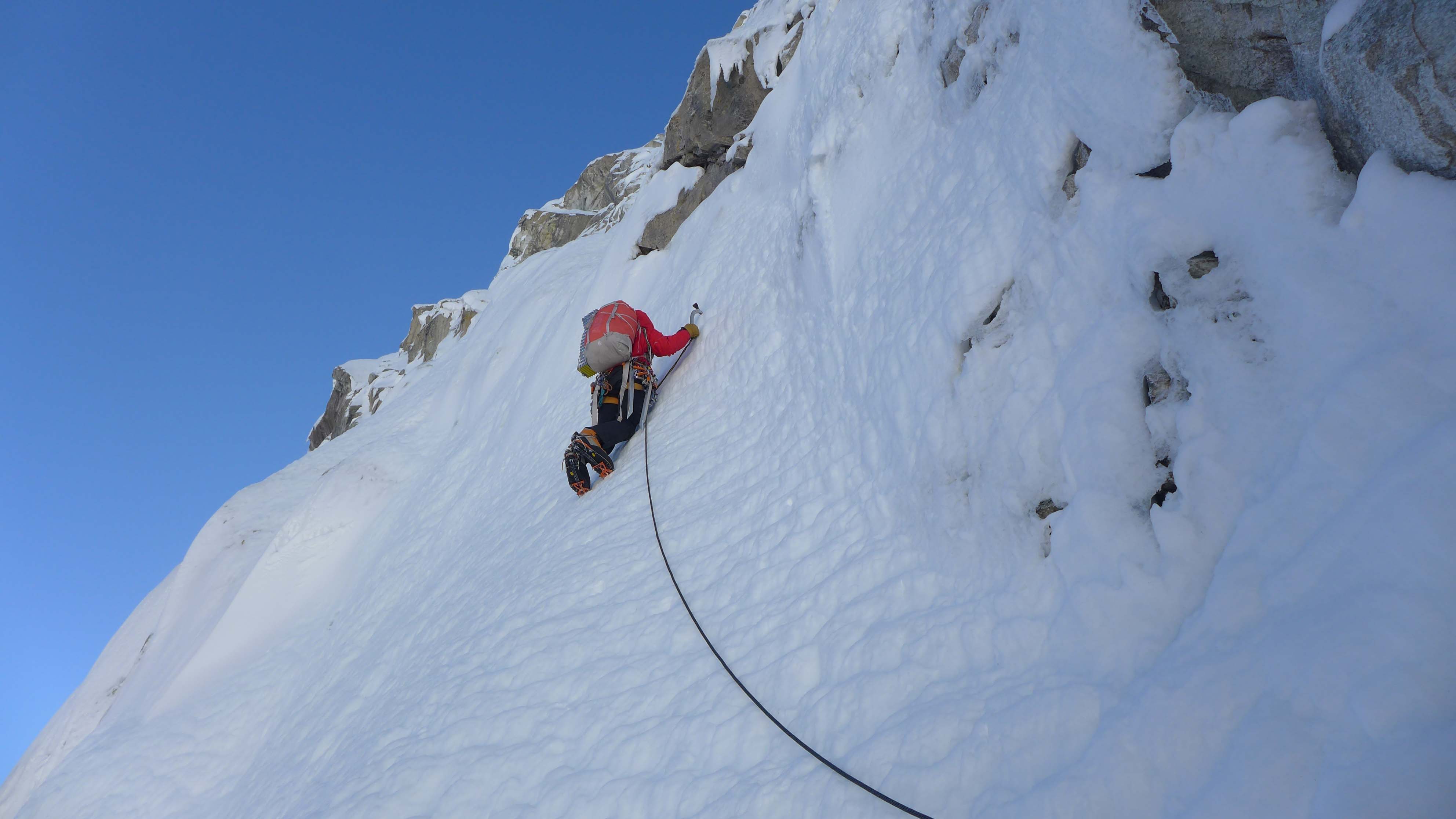 De klimcondities waren niet slecht: de sneeuw is hard en het team maakt in de firn snel progressie. Het nadeel is dat in firn slecht ijsboren gedraaid kunnen worden en er dus weinig tussenzekeringen kunnen worden geplaatst. Op ongeveer 6200 meter stopt het team voor de nacht en hakken ze een richel uit voor het bivak. Ze zijn positief gestemd, want de top is niet meer ver weg.
