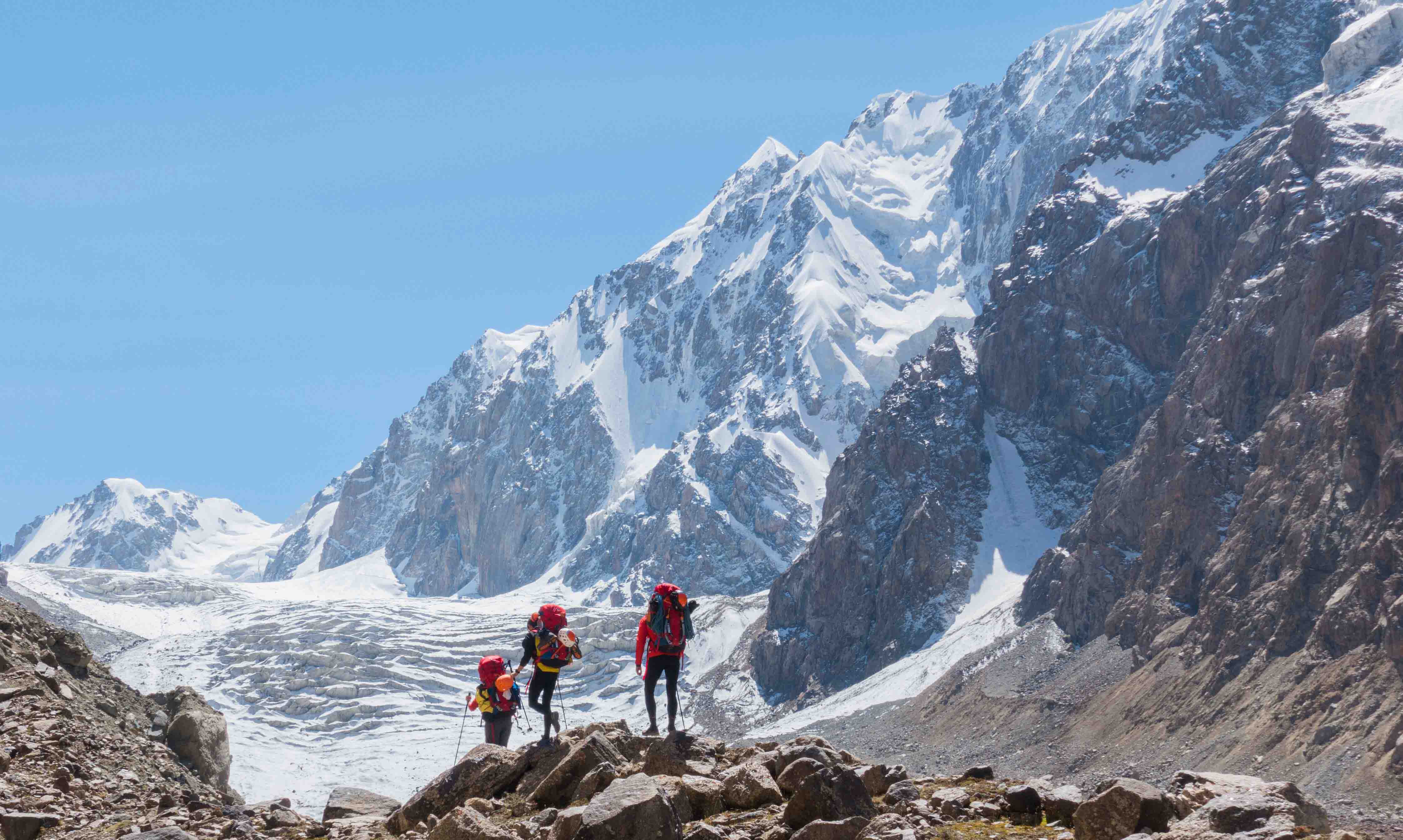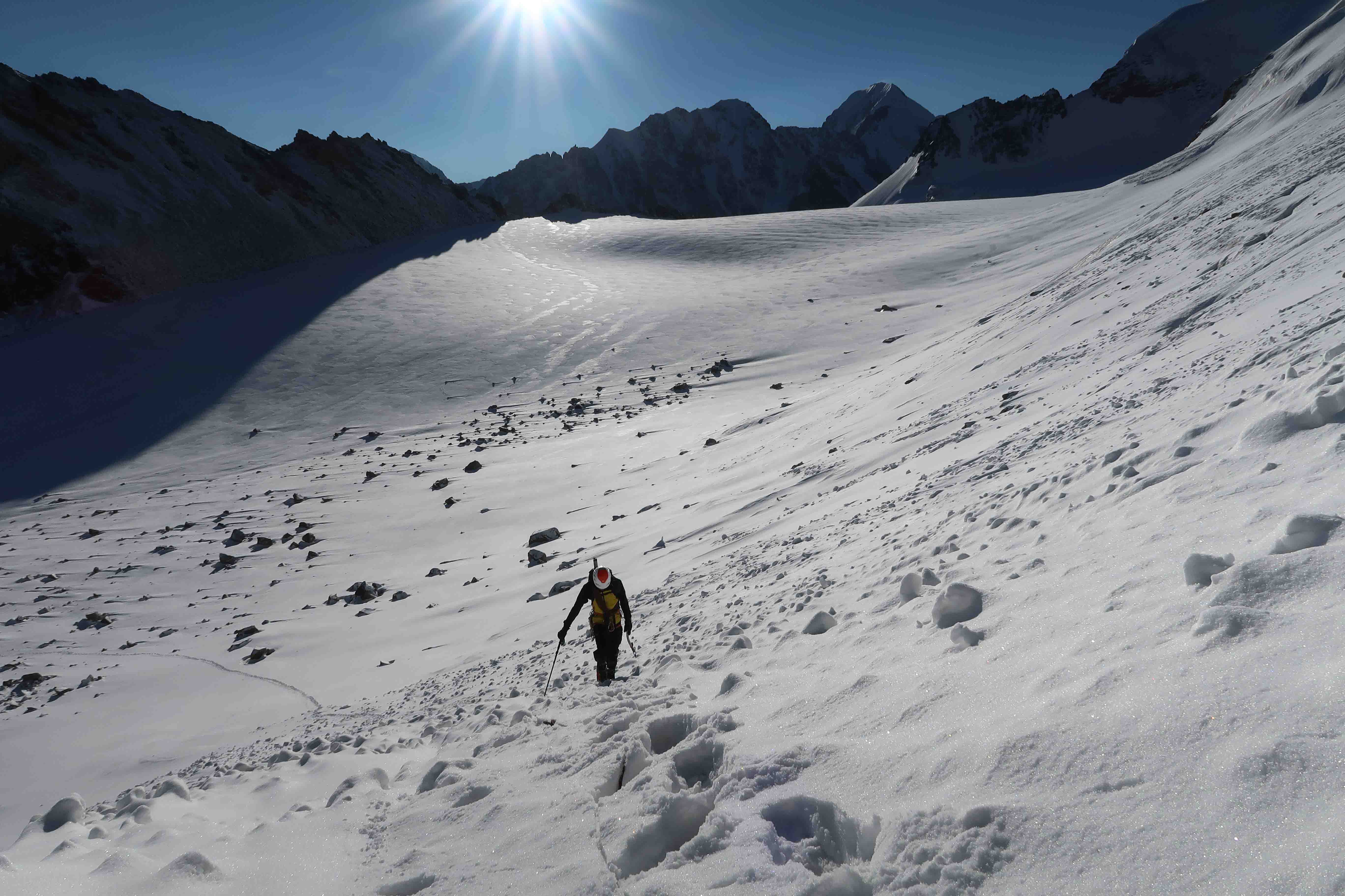 De expeditie begon voor de teamleden met ‘opwarmtouren’, die meteen een aantal succesvolle beklimmingen opleverden. Line, Wout en Court verbonden twee onbeklommen toppen (Pik Vsadnik, 4803m, en Pik Pionov, 4874m) via een 3 kilometer lange graat op de grens met China. De route noemden ze ‘No guts no glory ridge’ (D), vernoemd naar een van de jaarlijkse awards die in de Nederlandse bergsportwereld wordt uitgereikt. De beklimming kostte het team 20 uur van kamp tot kamp. Jorian, Noël, Rik en Boris deden de Peak Andrea (4566m) en Pik Surok (4606m) als opwarmer.
