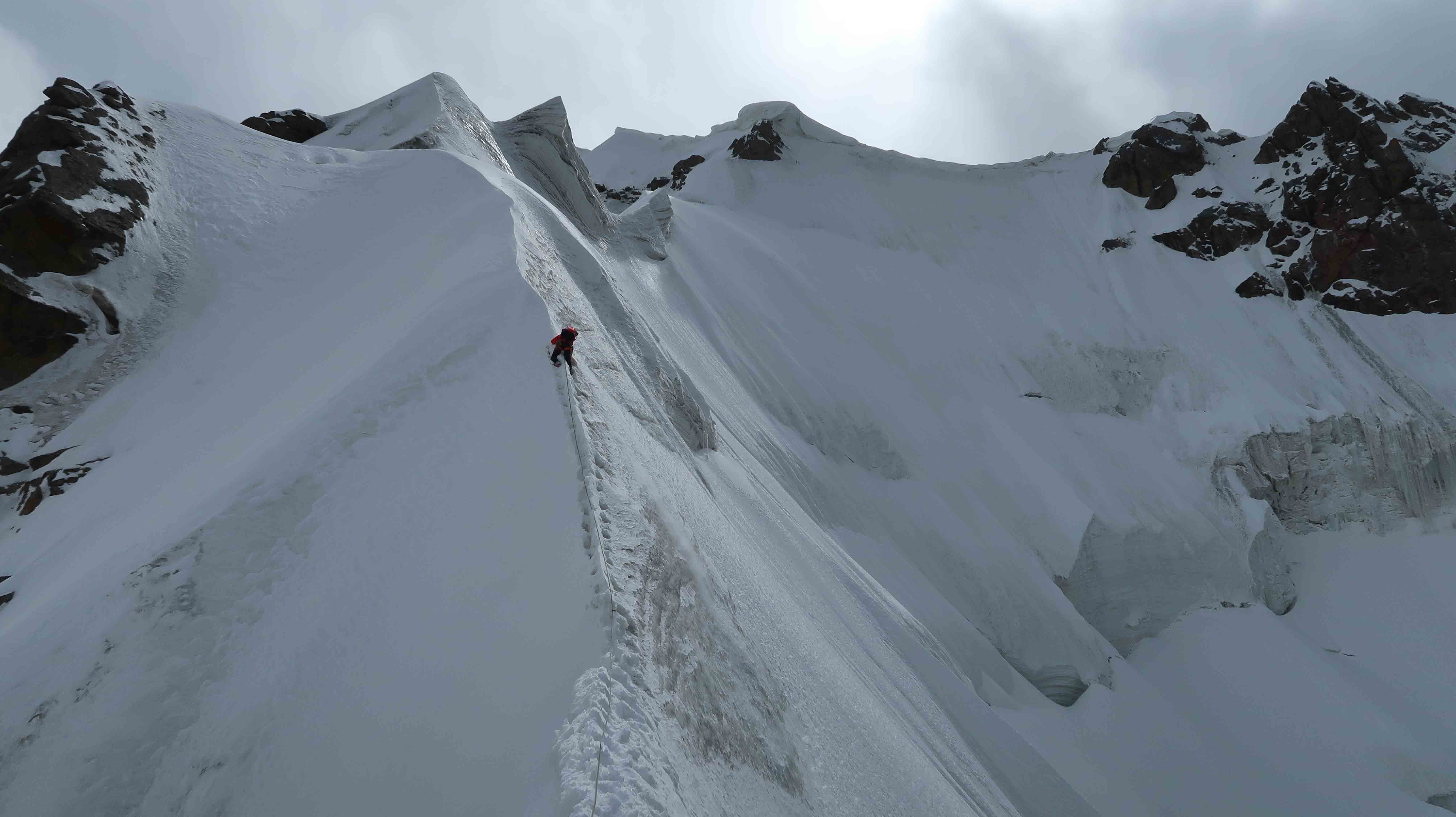 Na bijgekomen te zijn van hun eerdere beklimmingen, openden Line en Jorian ‘Line of Decline’ (TD-, 600m, 80°), een directe ijs- en mixed gully op de noordwand van Pik Currahee (5025m). De naam van de route verwijst naar de slechter wordende ijscondities naarmate het team dichter bij de top kwam, en naar de expeditiemoeheid die het team al voelde voordat ze aan de klim begonnen.