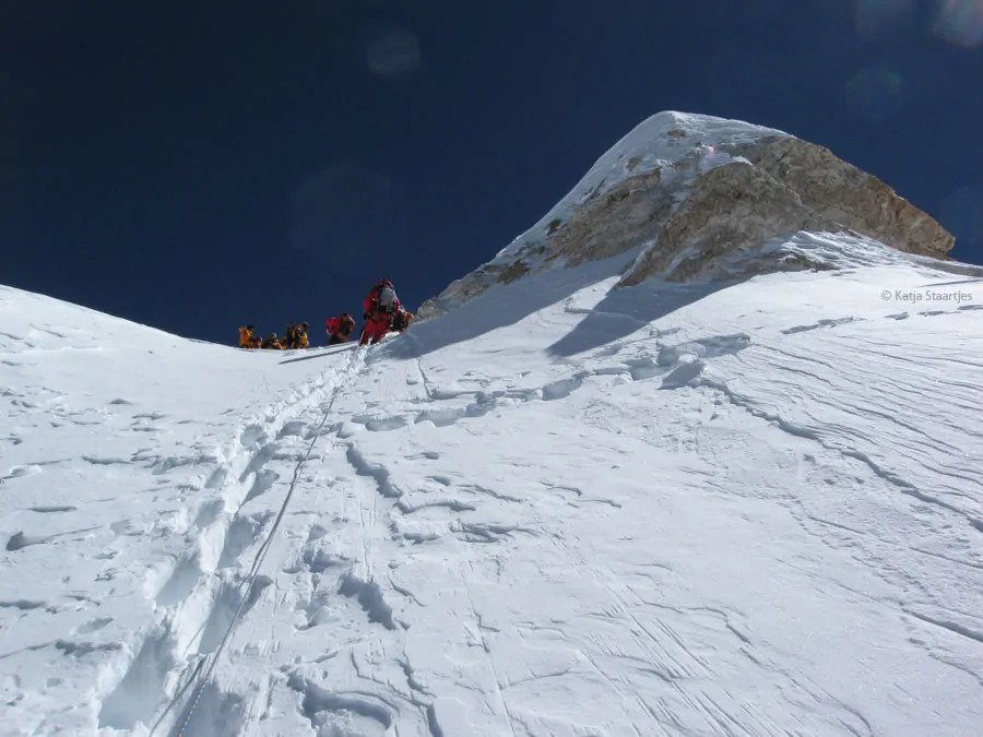 Met een klein groepje vertrekt het Nederlandse klimduo de volgende dag (3 oktober) als eerste richting top. Onderweg lenen ze hun touw uit aan een expeditie van Himex, onder voorwaarde dat zij het touw alleen in het laatste stuk onder de top zullen fixeren. Even later zien zij klimmers van Himex elkaar omhelzen op een ‘bult’ die door hen aangezien wordt voor de hoofdtop. Later blijkt dit echter de voortop te zijn. Katja en Henk zijn daar al tijdens de beklimming van overtuigd, maar hebben vanwege het uitlenen geen touw meer en moeten noodgedwongen met de klimmers van Himex afdalen.