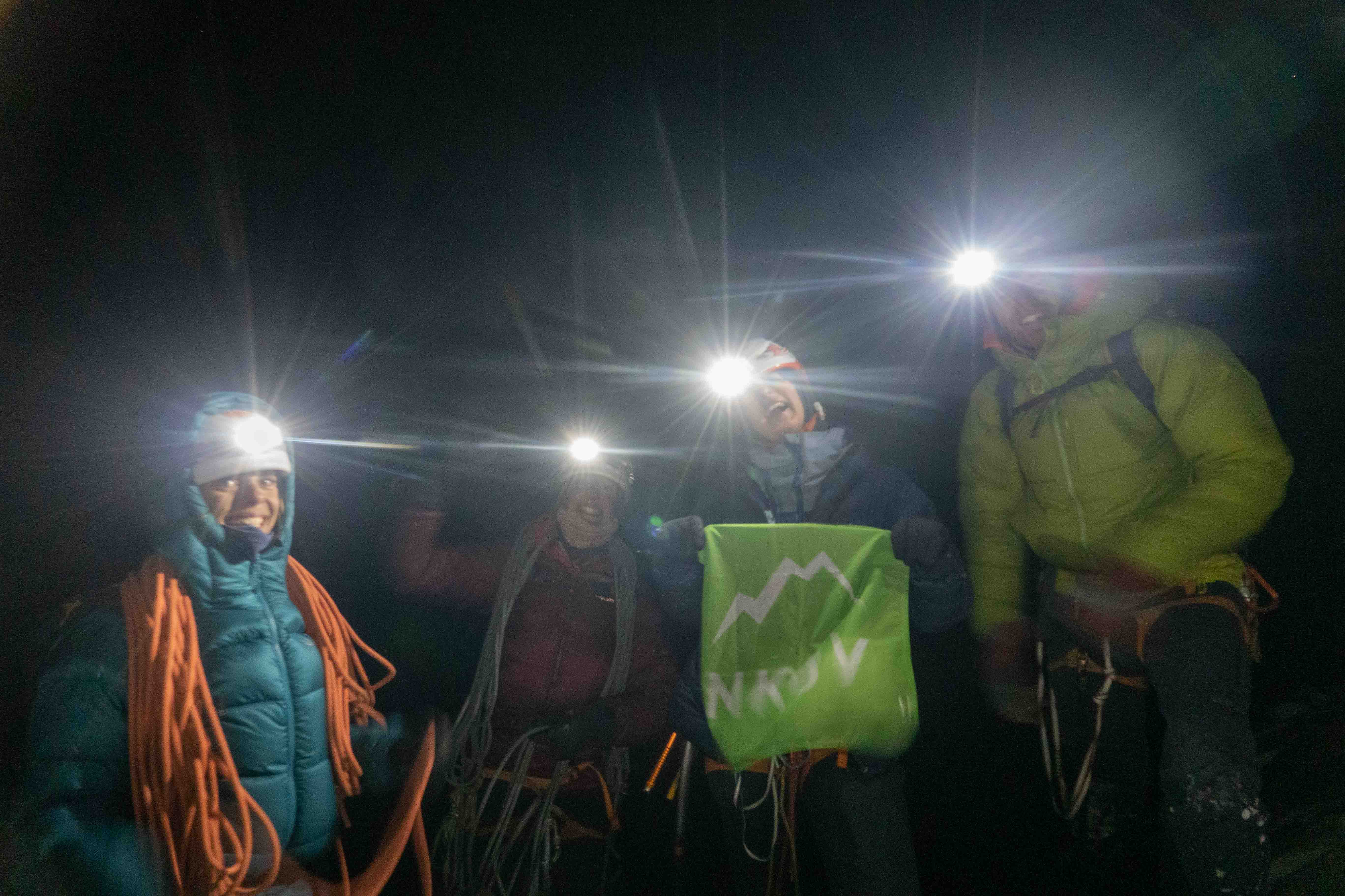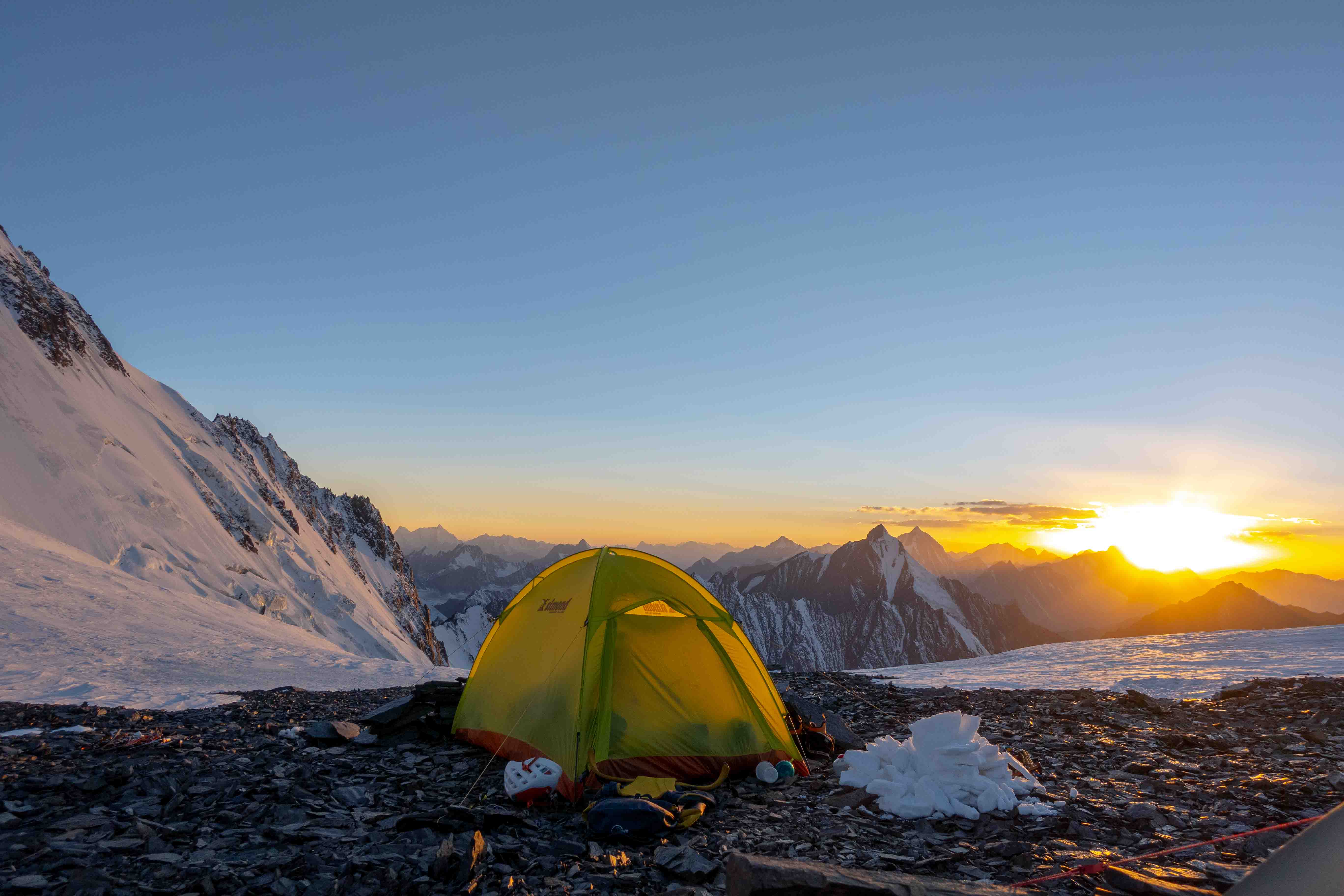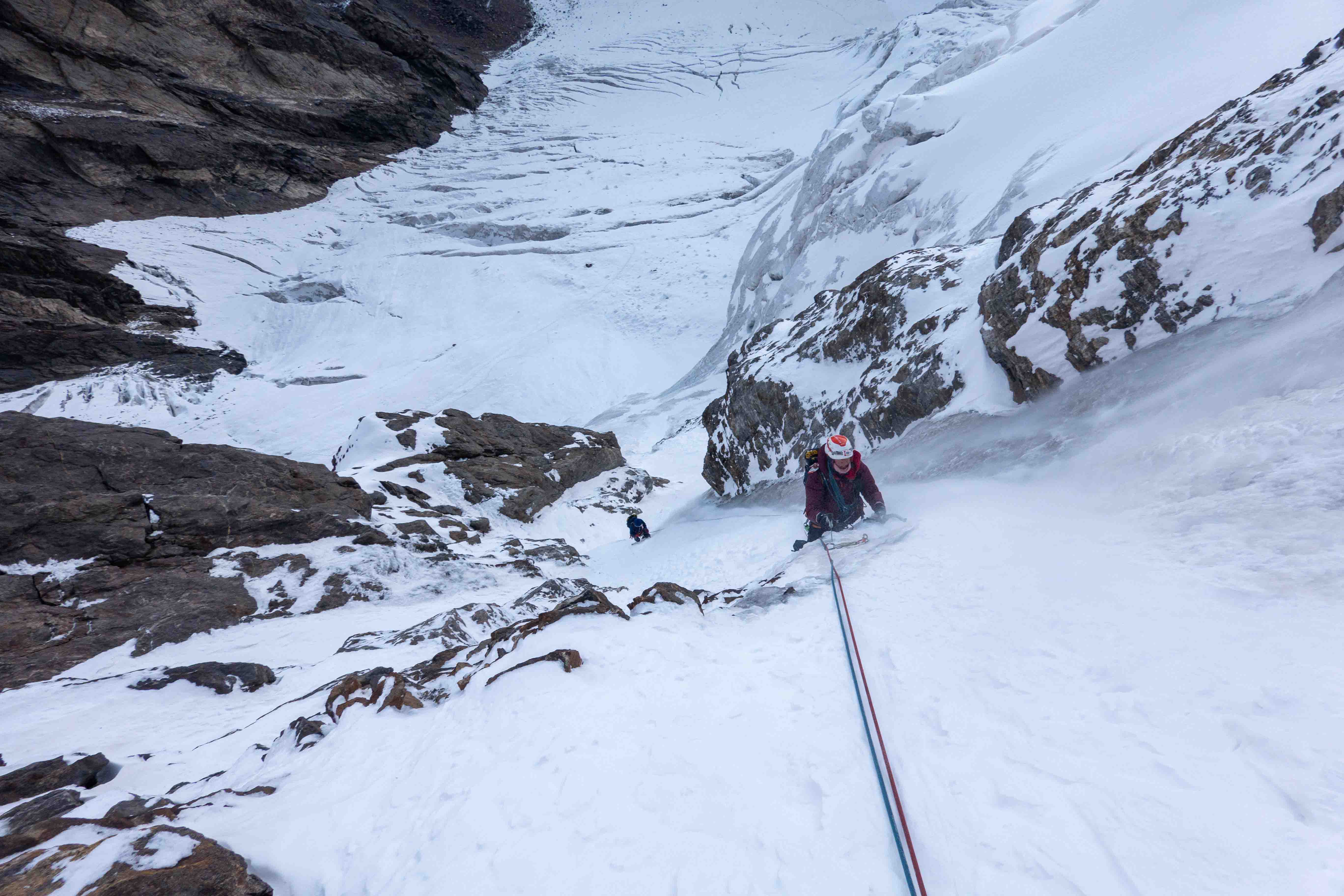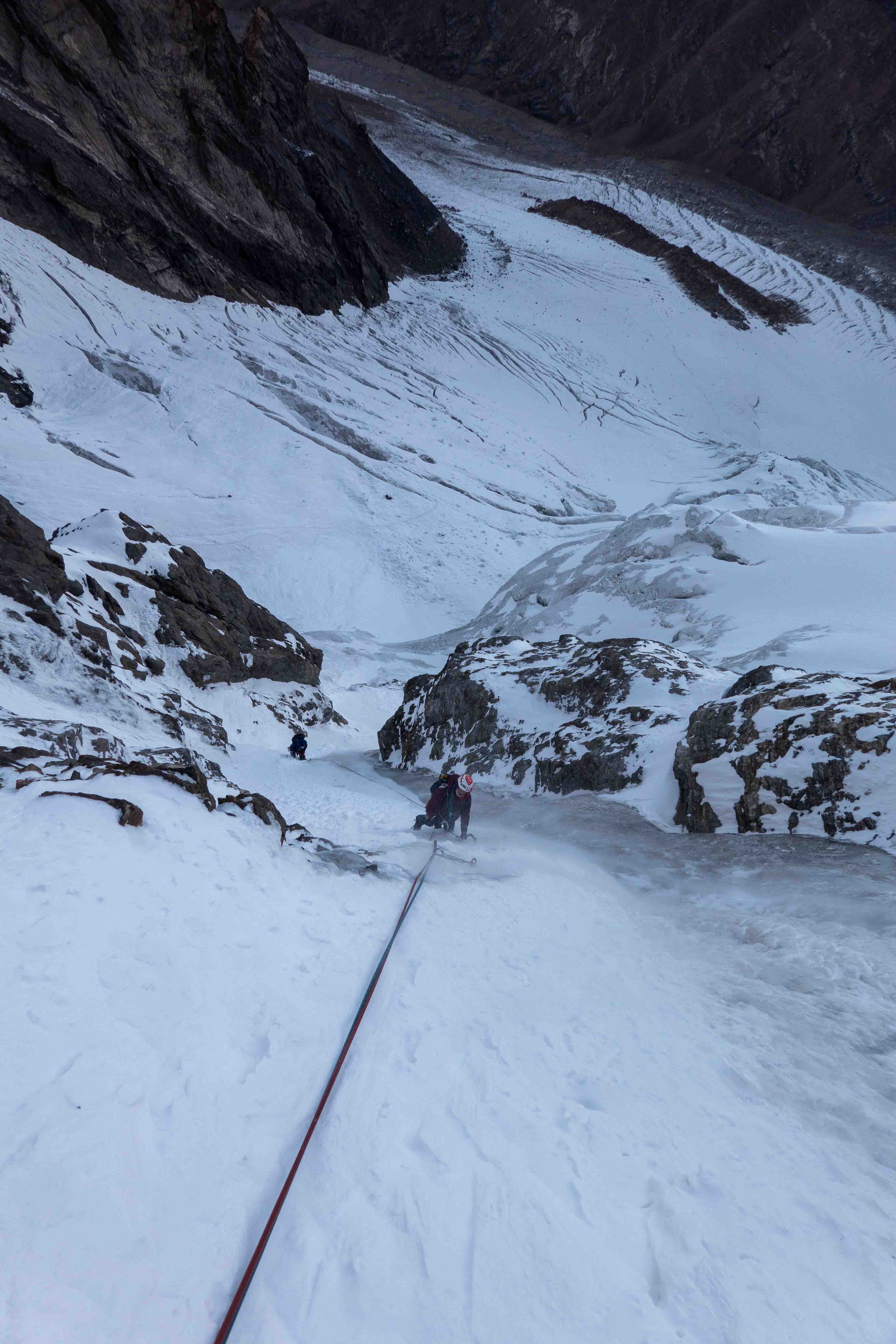 Na de verkenning was het team klaar voor het echte werk. Vanuit een vooruitgeschoven basiskamp (ABC) op 3900m klommen twee teams nieuwe ijslijnen op ‘Hidden Peak’. Noor, Regien en Bas klommen het oostcouloir (1000hm, TD- AI3, M4) en noemden hun route ‘Diagonale du Fou’. Dennis en Anniek klommen een 400m lange ijslijn op de noordwand, gevolgd door het oostcouloir op 4600m (1000hm in totaal TD+ AI5 M4) en noemden hun variant ‘Directe du Fou’. De twee teams hebben gezamenlijk het laatste deel geklommen en besloten af te dalen na de technische moeilijkheden, voordat de top werd bereikt, op een hoogte van ongeveer 4900, omdat ze geen bivak materialen bij zich hadden.