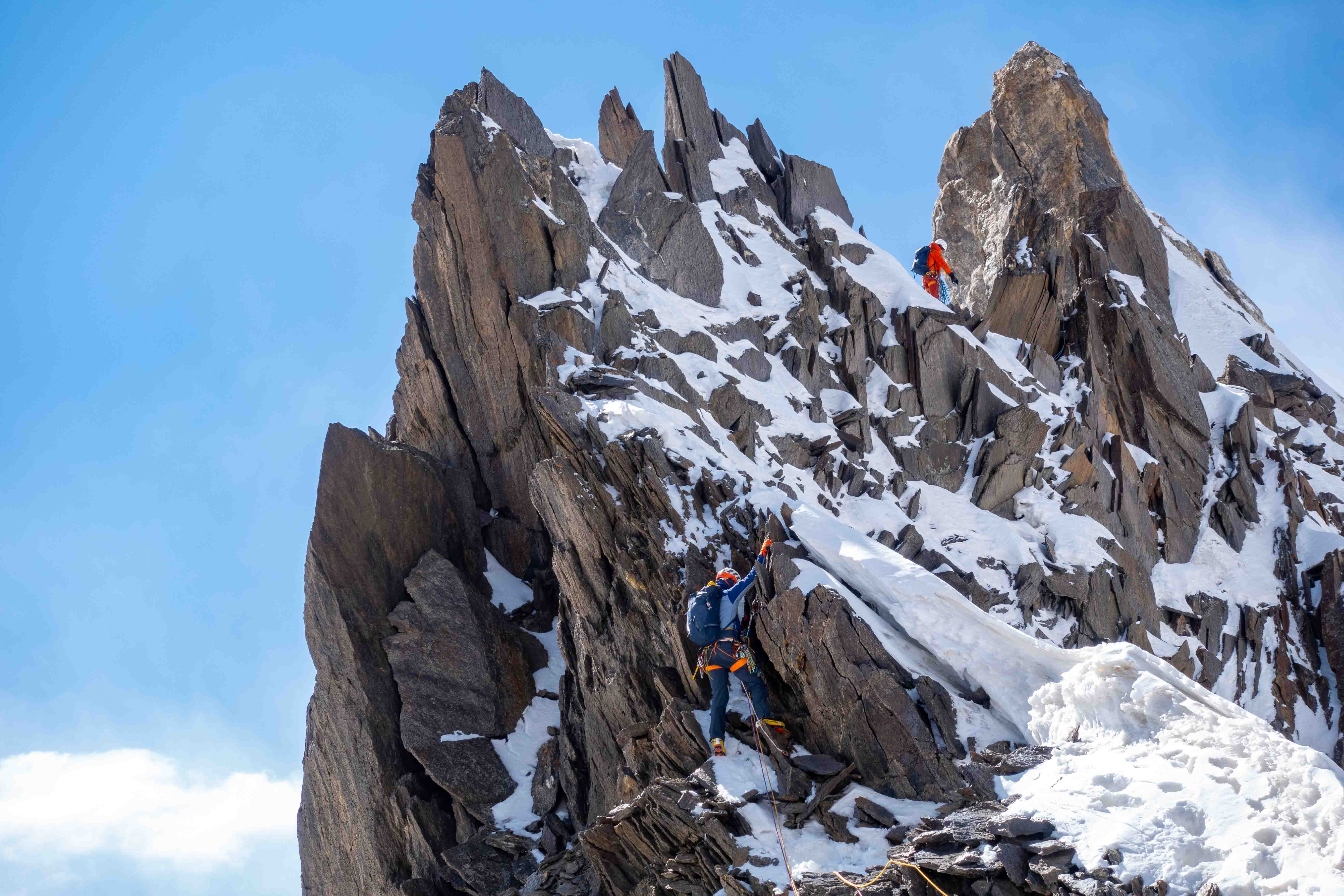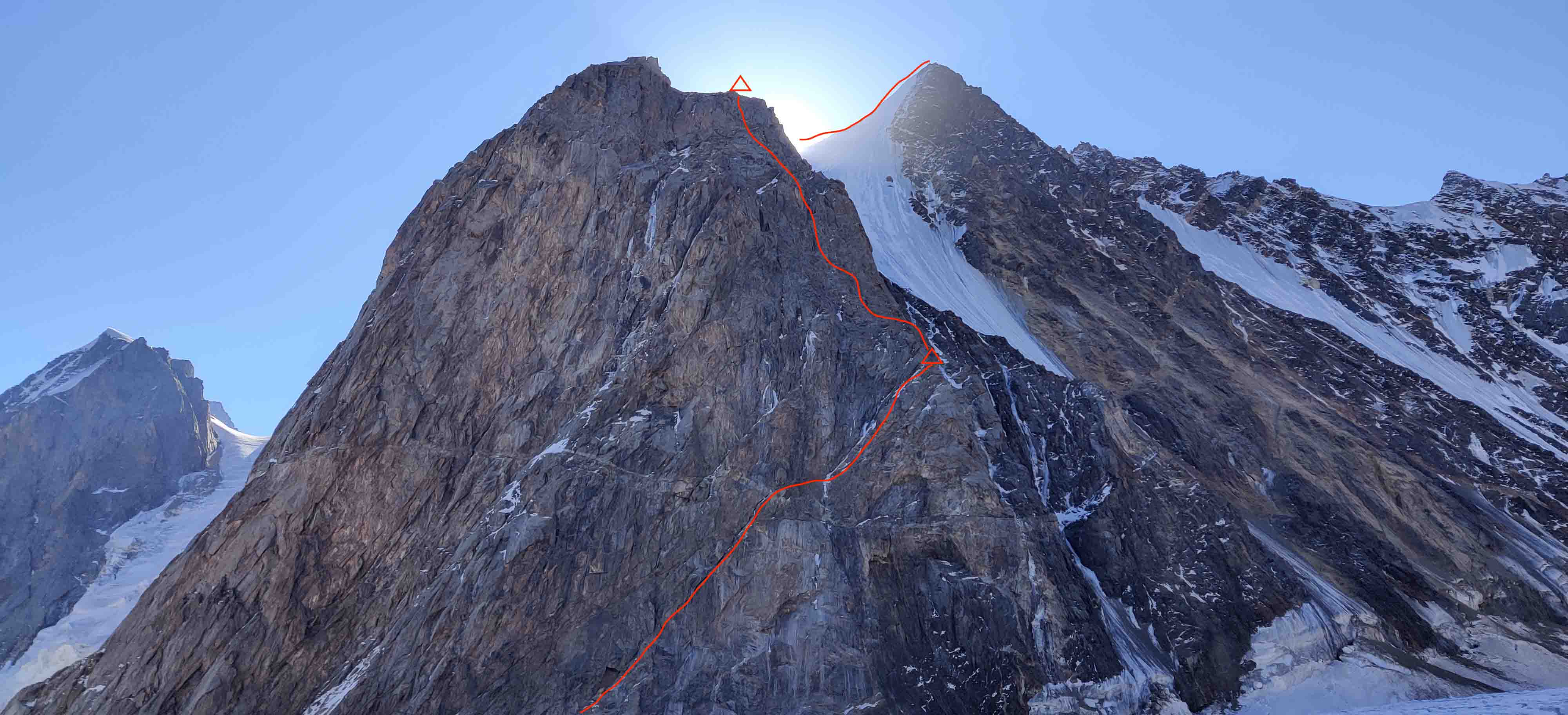 Tijdens dezelfde periode van goed weer zijn ook twee andere teams op pad gegaan naar de zuidelijk vertakking van de vallei, voor pogingen op twee andere toppen. Jeffrey en Michiel hadden hun oog laten vallen op een technische lijn op een top zonder naam (ca. 5015m) die aardig leek op de beroemde Frendopijler in Chamonix.