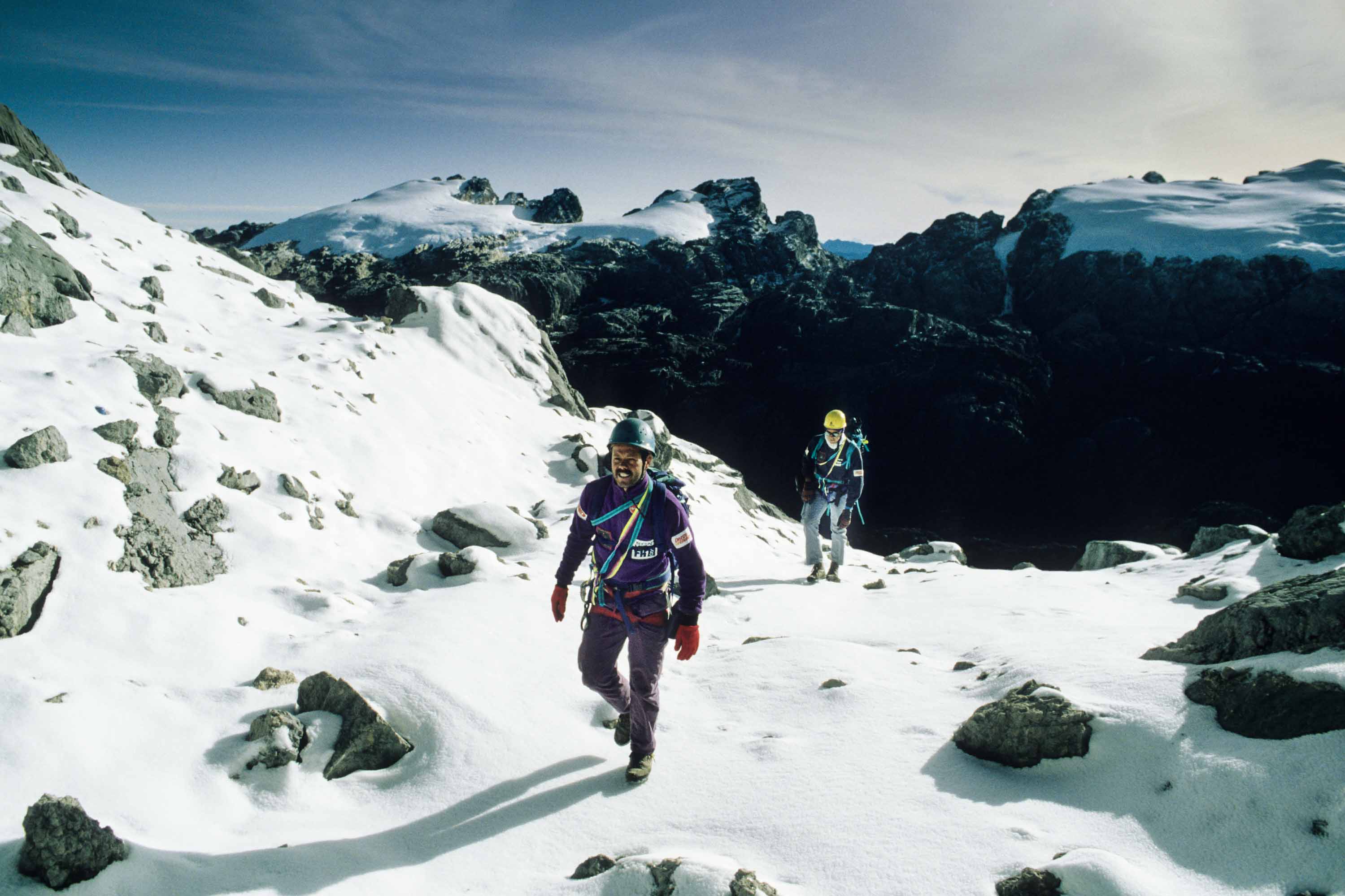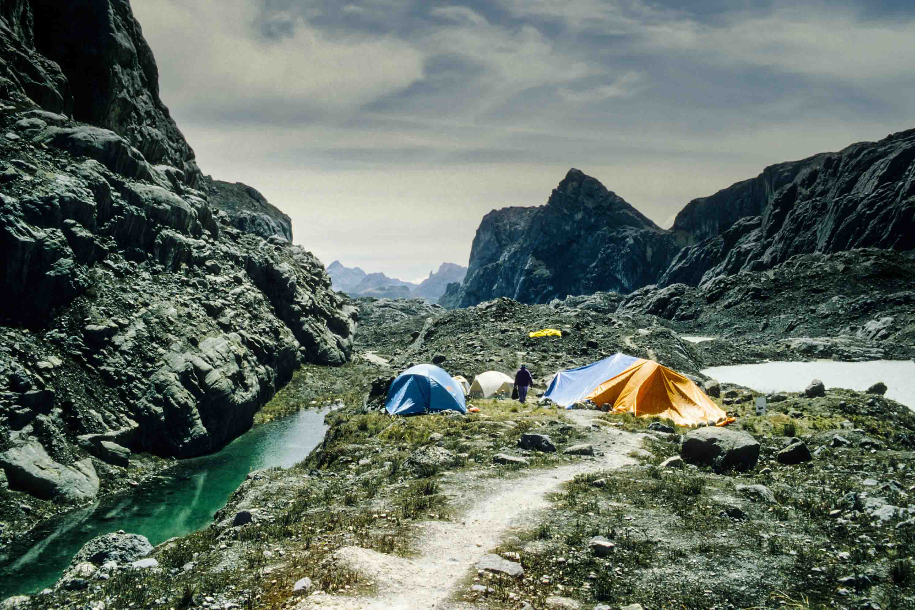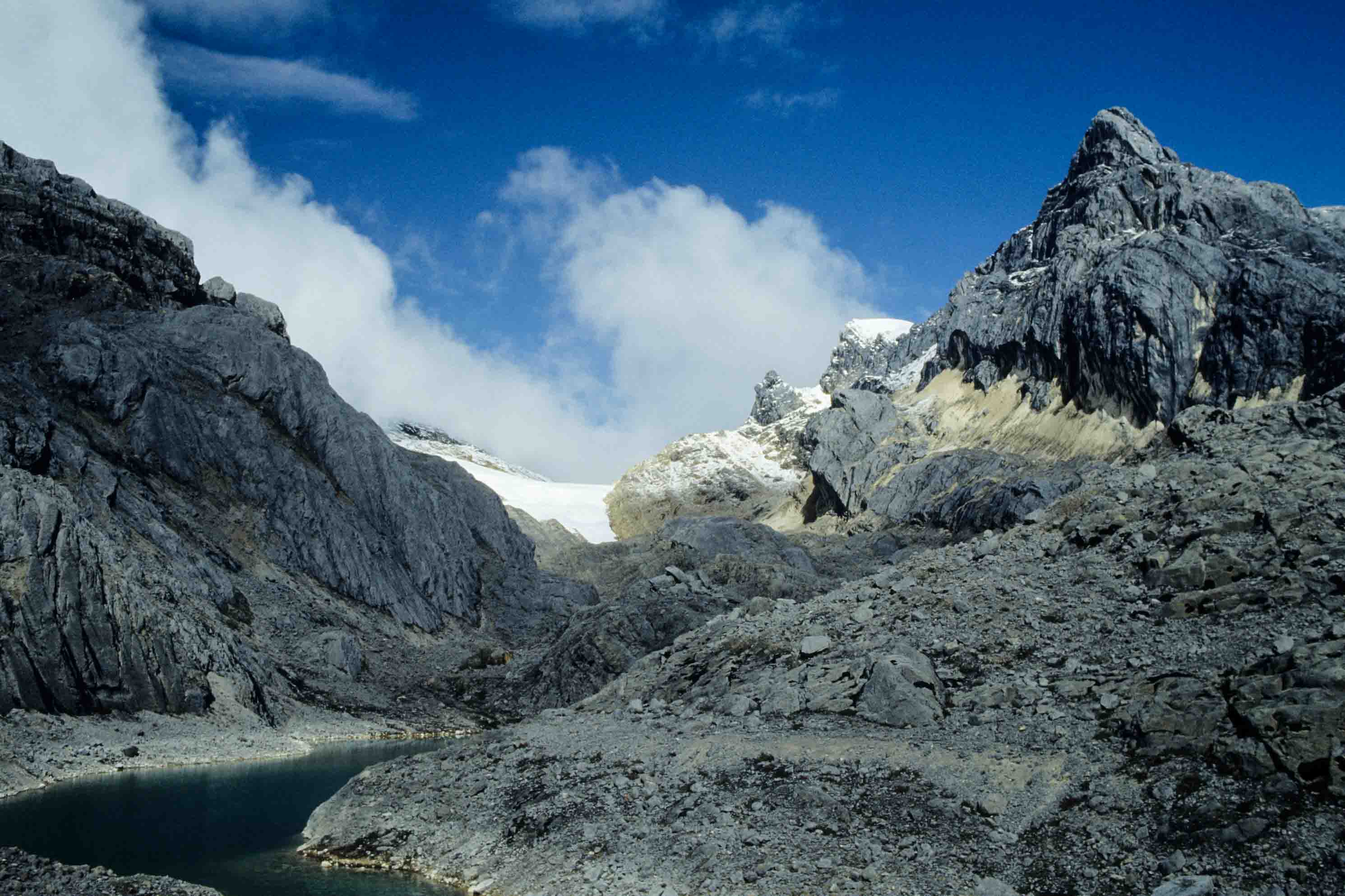 Basiskamp in de Merenvallei (4050 m). Toen in 1936 de Nederlandse klimmers Anton Colijn, Jean Jacques Dozy en Frits Wissel als eerste blanken voet in de Merenvallei zetten, waren de meertjes er nog niet. Hier lag toen een gletsjer, die door de Nederlanders Merengletsjer genoemd werd, vanwege de vele meertjes die in het gletsjerijs ontstaan waren.