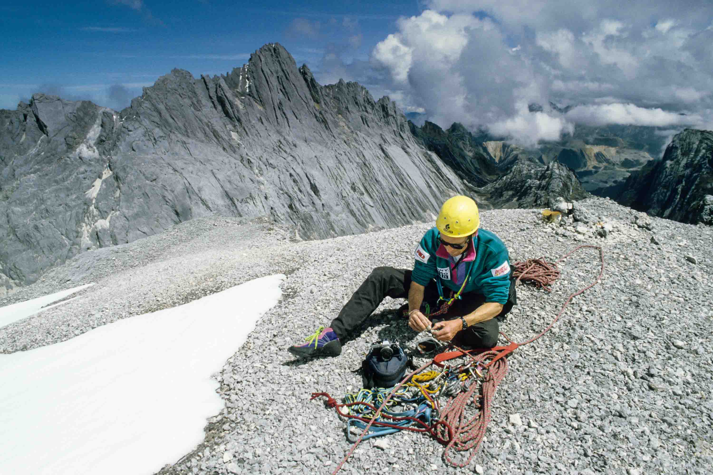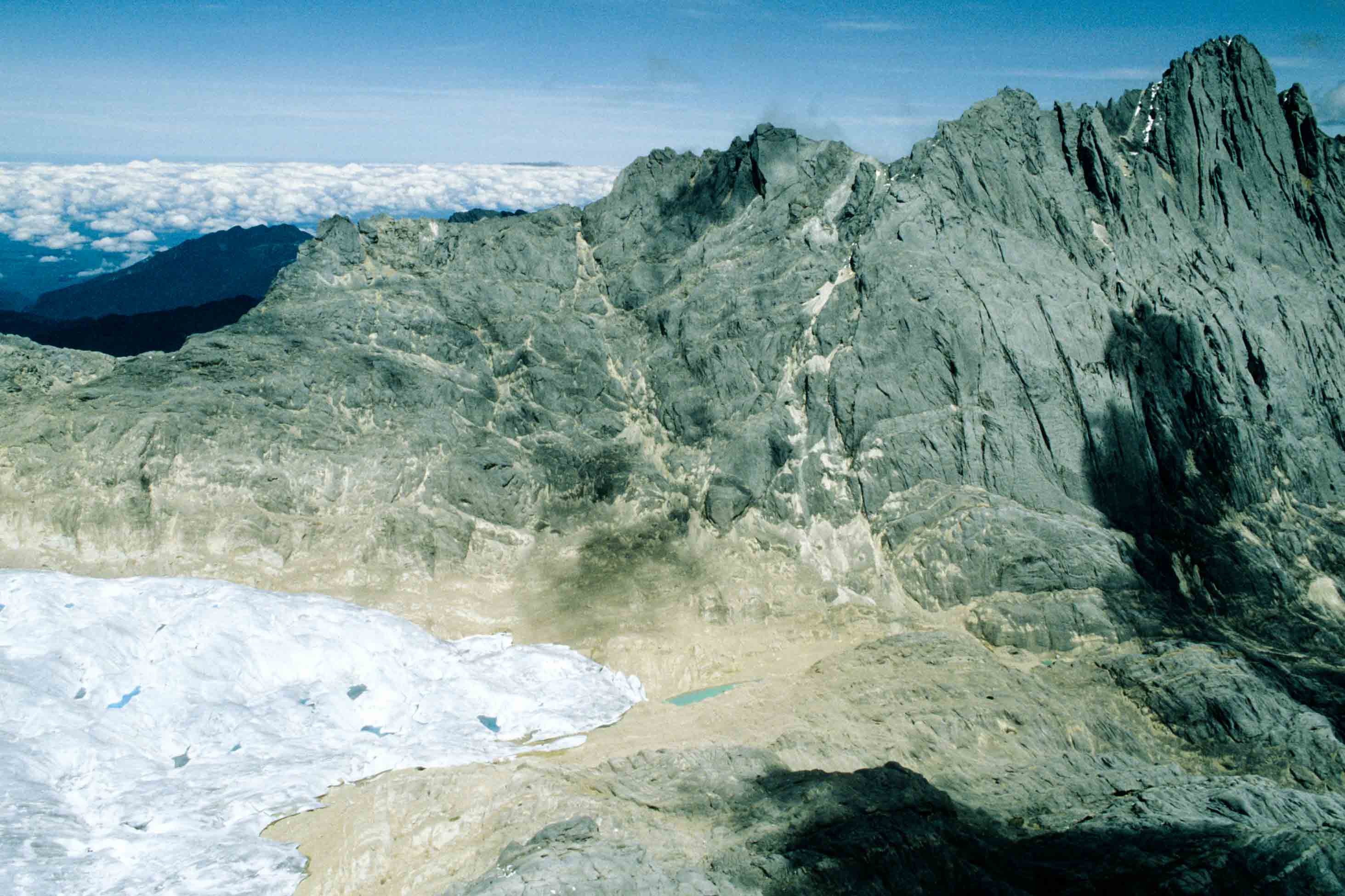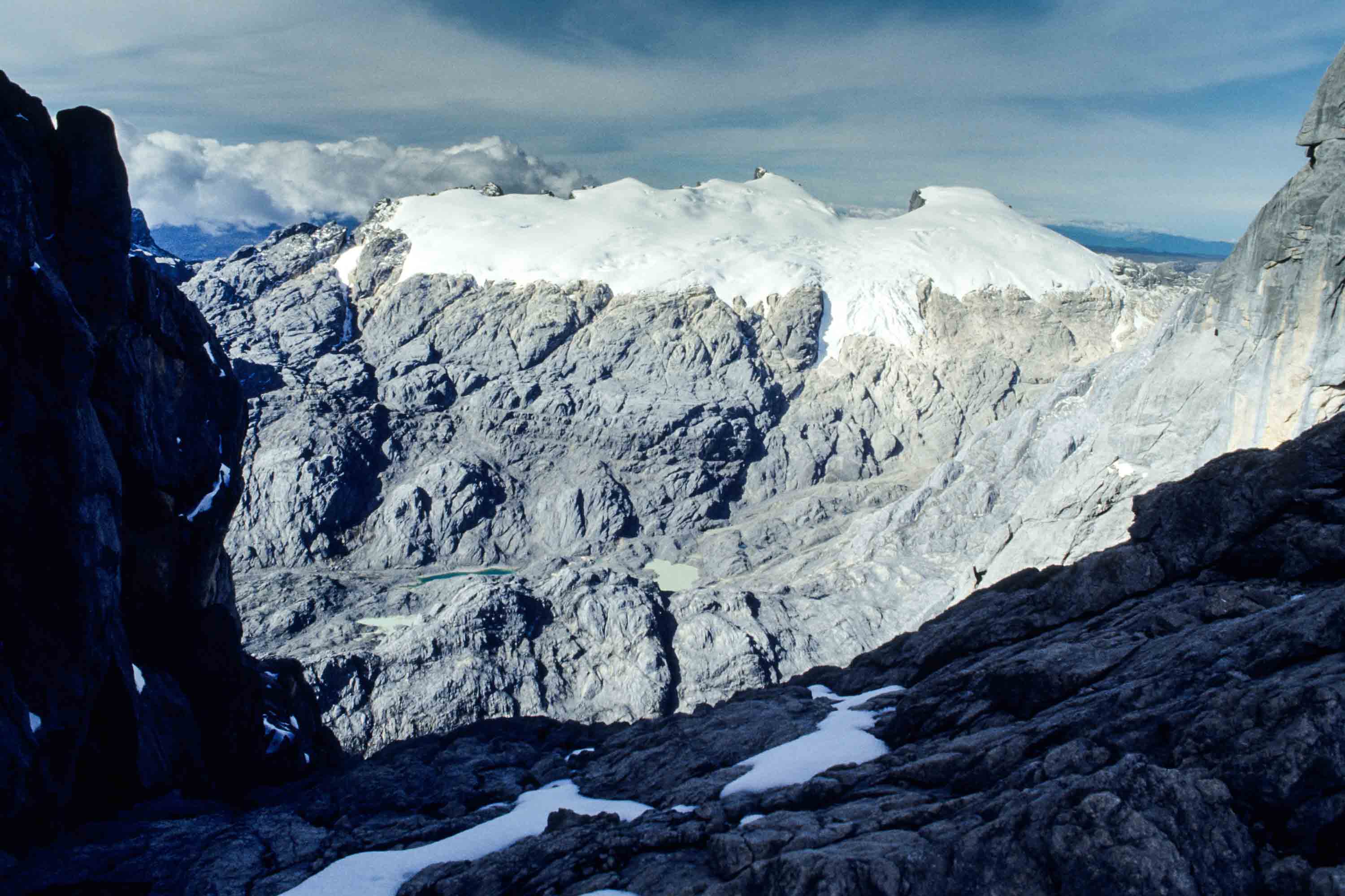 Basiskamp in de Merenvallei (4050 m). Toen in 1936 de Nederlandse klimmers Anton Colijn, Jean Jacques Dozy en Frits Wissel als eerste blanken voet in de Merenvallei zetten, waren de meertjes er nog niet. Hier lag toen een gletsjer, die door de Nederlanders Merengletsjer genoemd werd, vanwege de vele meertjes die in het gletsjerijs ontstaan waren.