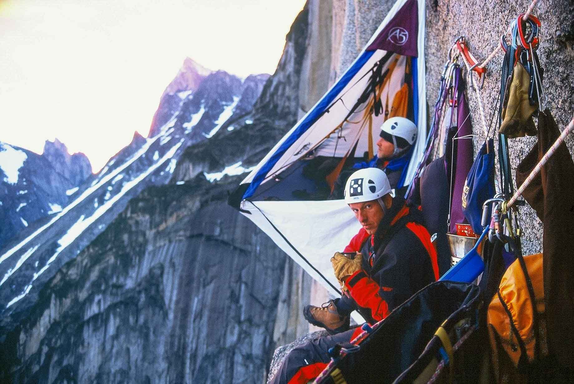 Hans en Martin in het portaledge bivak op de 800 meter hoge westwand van de Nalumasortoq.
