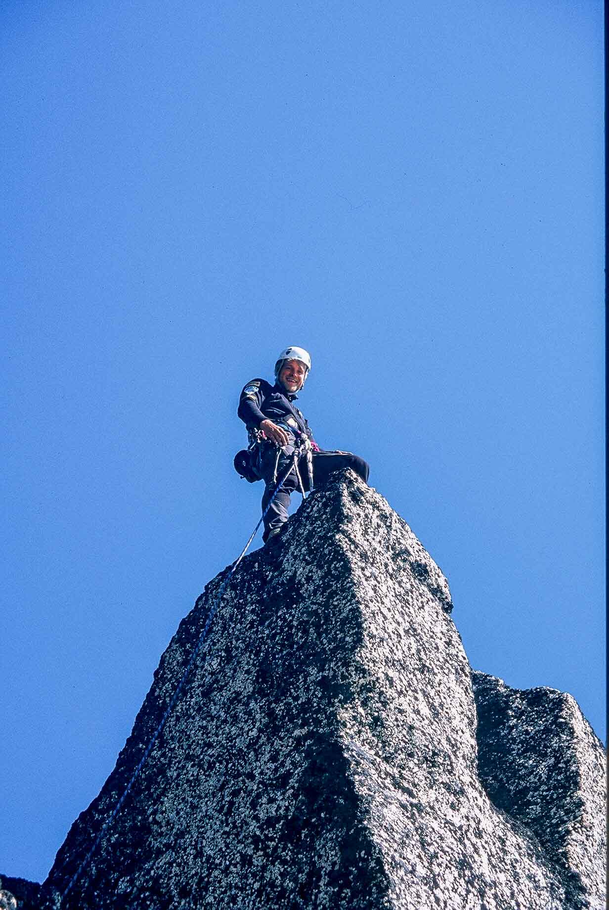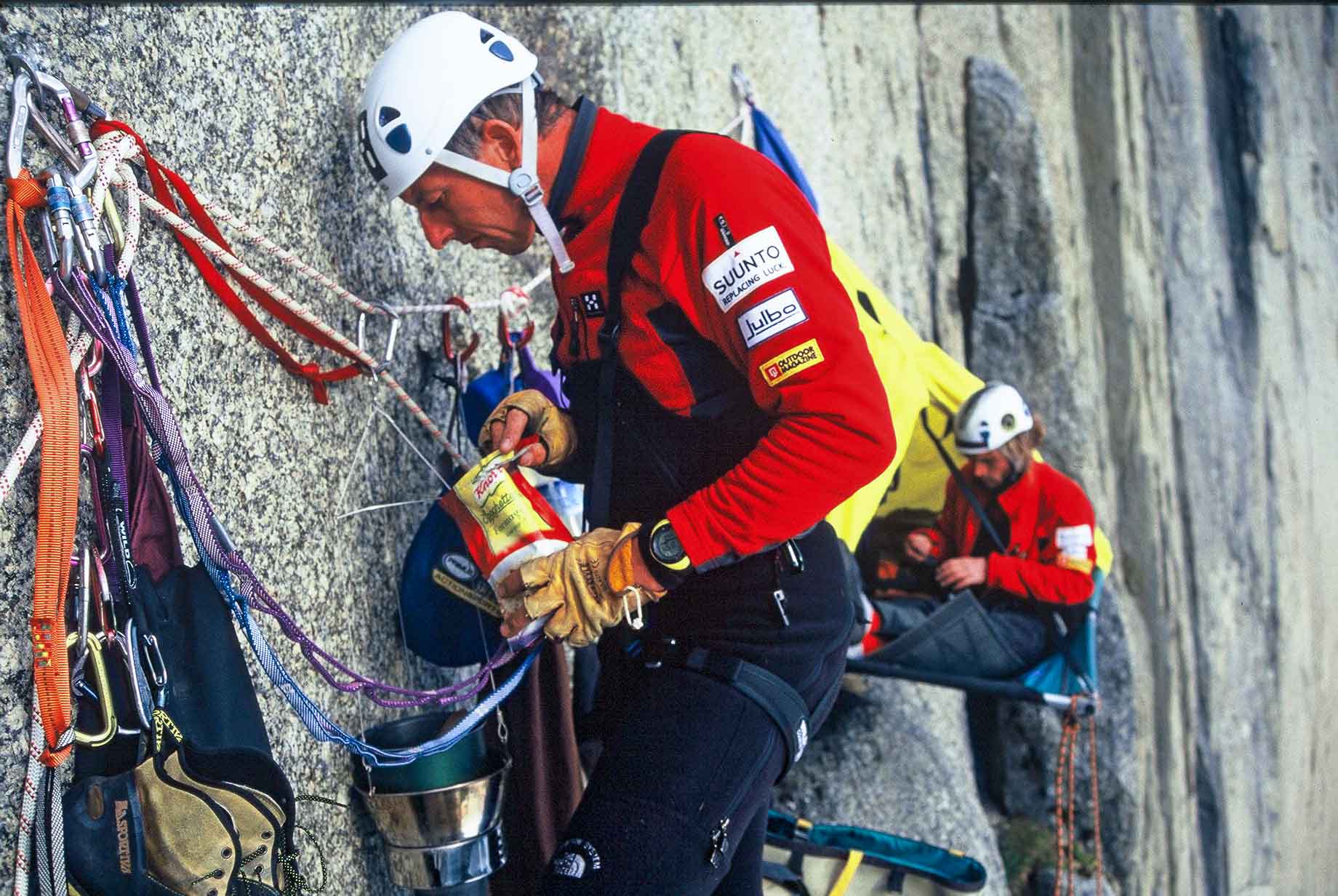Bigwall stijl met vaste touwen.