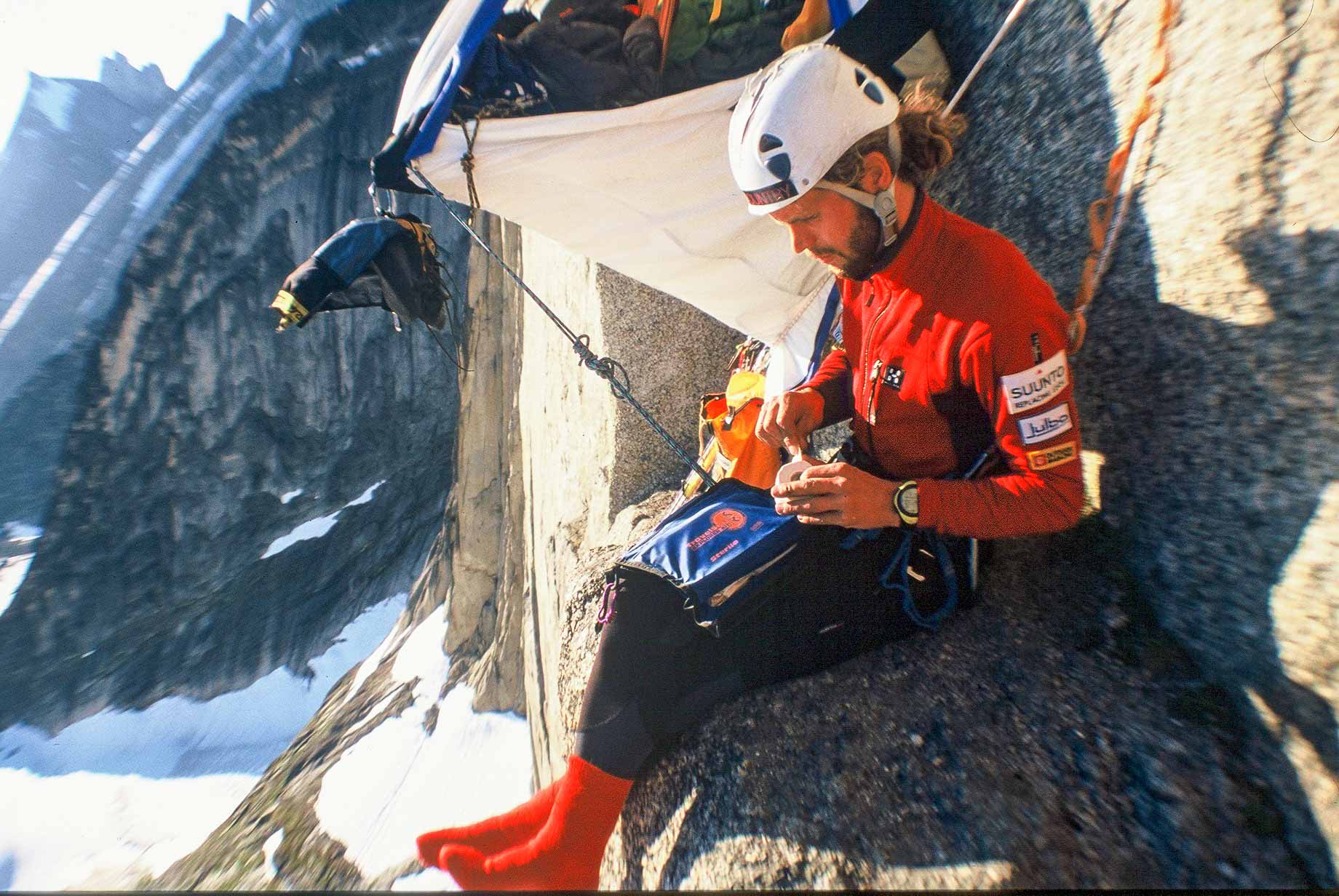 Martin in het portaledge bivak op de 800 meter hoge westwand van de Nalumasortoq.