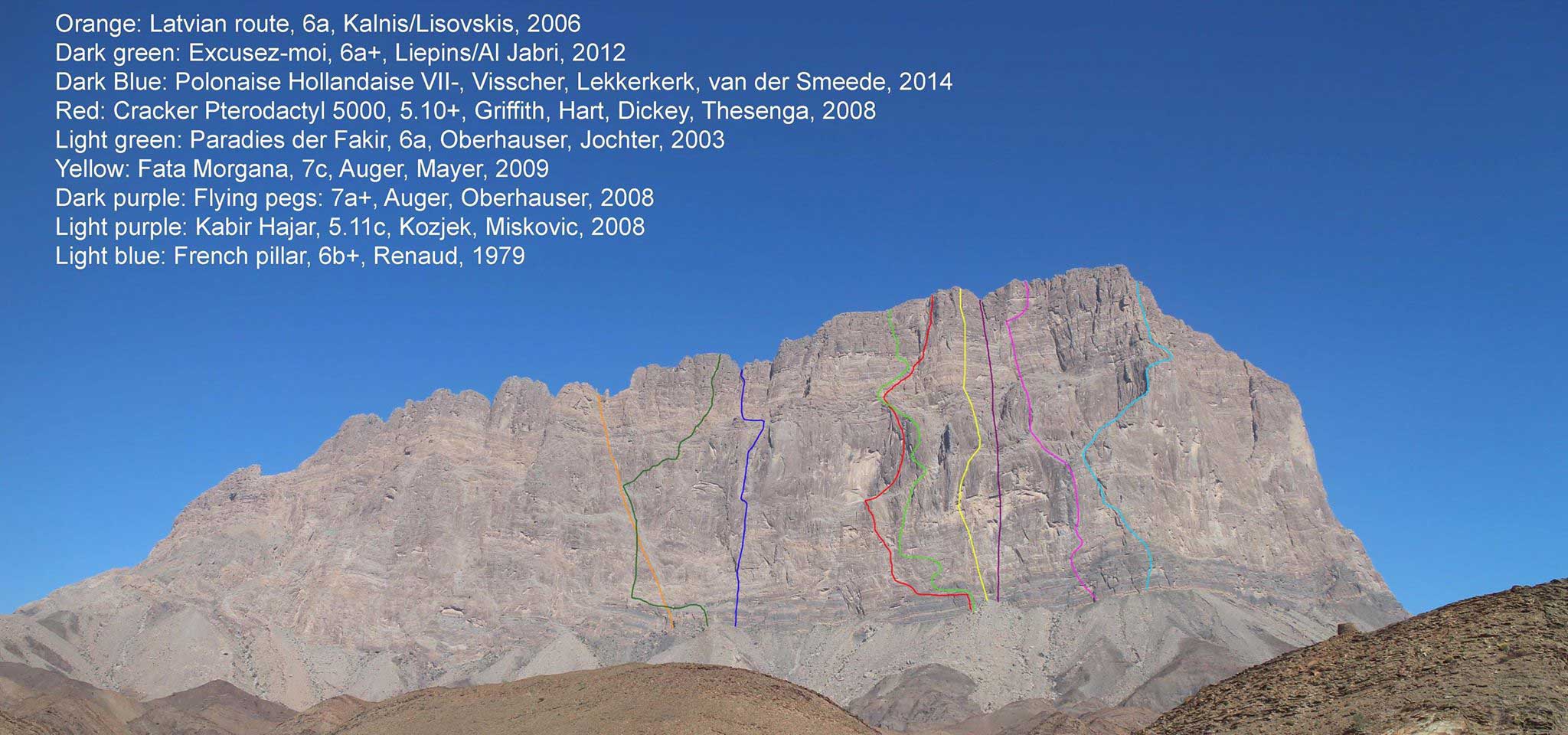 Het viertal deed een beklimming van de Jebel Misht via een mogelijke nieuwe route genaamd Polonaise Hollandaise (800m, 6a+). Ze hadden een bivak in het midden van de wand en een bivak tijdens de afdaling. Niet op hoofdtop geweest. Na contact te hebben gehad met lokale klimmers, blijkt dat de grote hoekversnijding mogelijk al eerder is beklommen. Online is hier geen documentatie over de te vinden. De rotskwaliteit was zeer goed. De maximale moeilijkheidsgraad was ongeveer 6b, de veel lengtes waren tussen de 5b en 6a. Volgens de eerstbeklimmers is de route het waard om te herhalen.