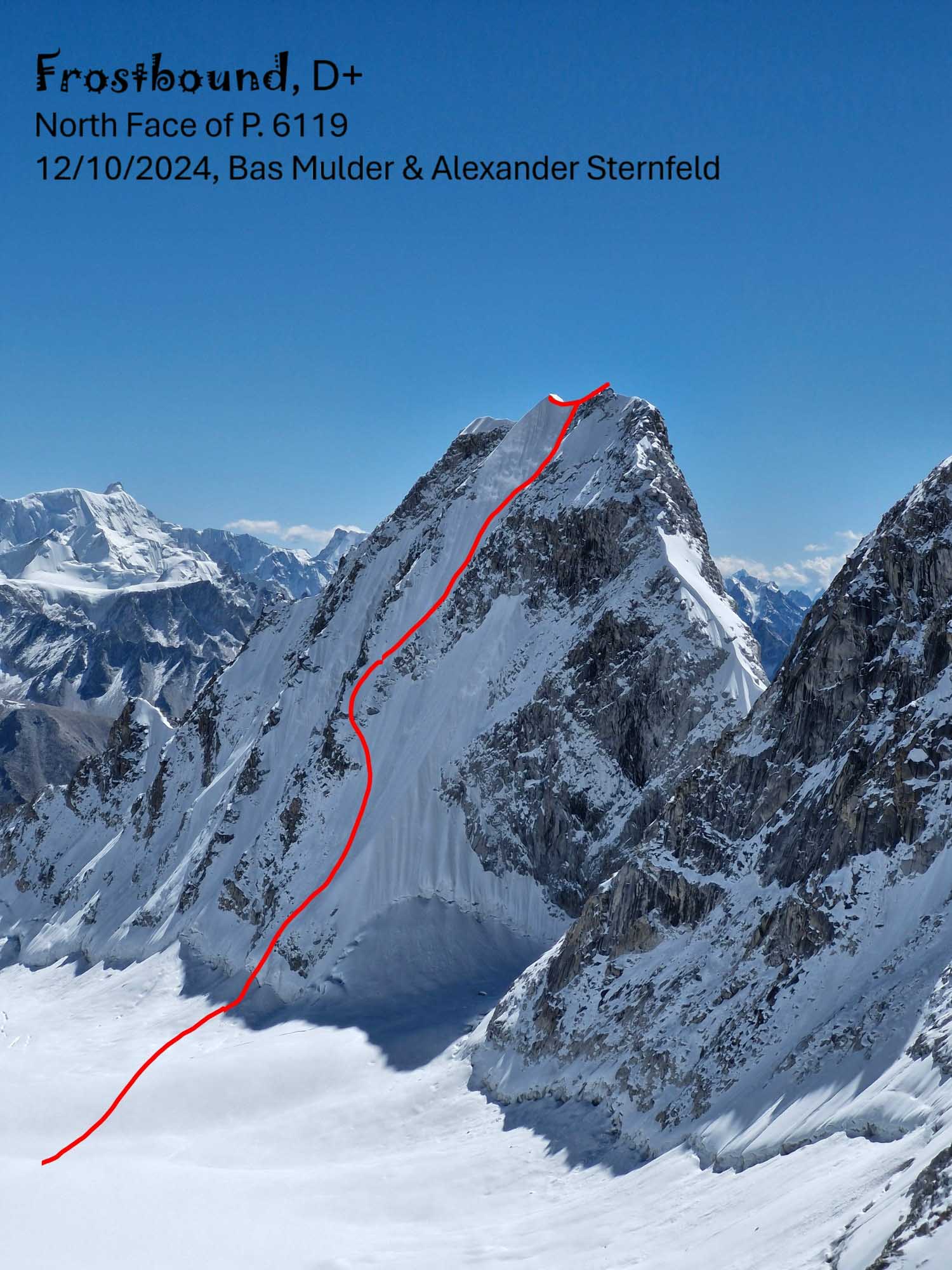 Enkele dagen later hebben Alexander en Bas (met gerepareerde tent) de noordwand van P. 6119 beklommen. De wand was uitdagend gezien de poedersneeuw en het gebrek aan ijs, wat betekende dat goede zekermogelijkheden zeldzaam waren. Hoewel het windstil was, was het erg koud. Rond 14.00 uur stonden Alexander en Bas op de top, waarna ze de wand hebben afgedaald met een combinatie van abseilen en afklimmen. Tegen zonsondergang stond het team weer op de gletsjer. De route hebben ze “frostbound” (D+) genoemd, wat refereert aan de gevolgen van de beklimming…