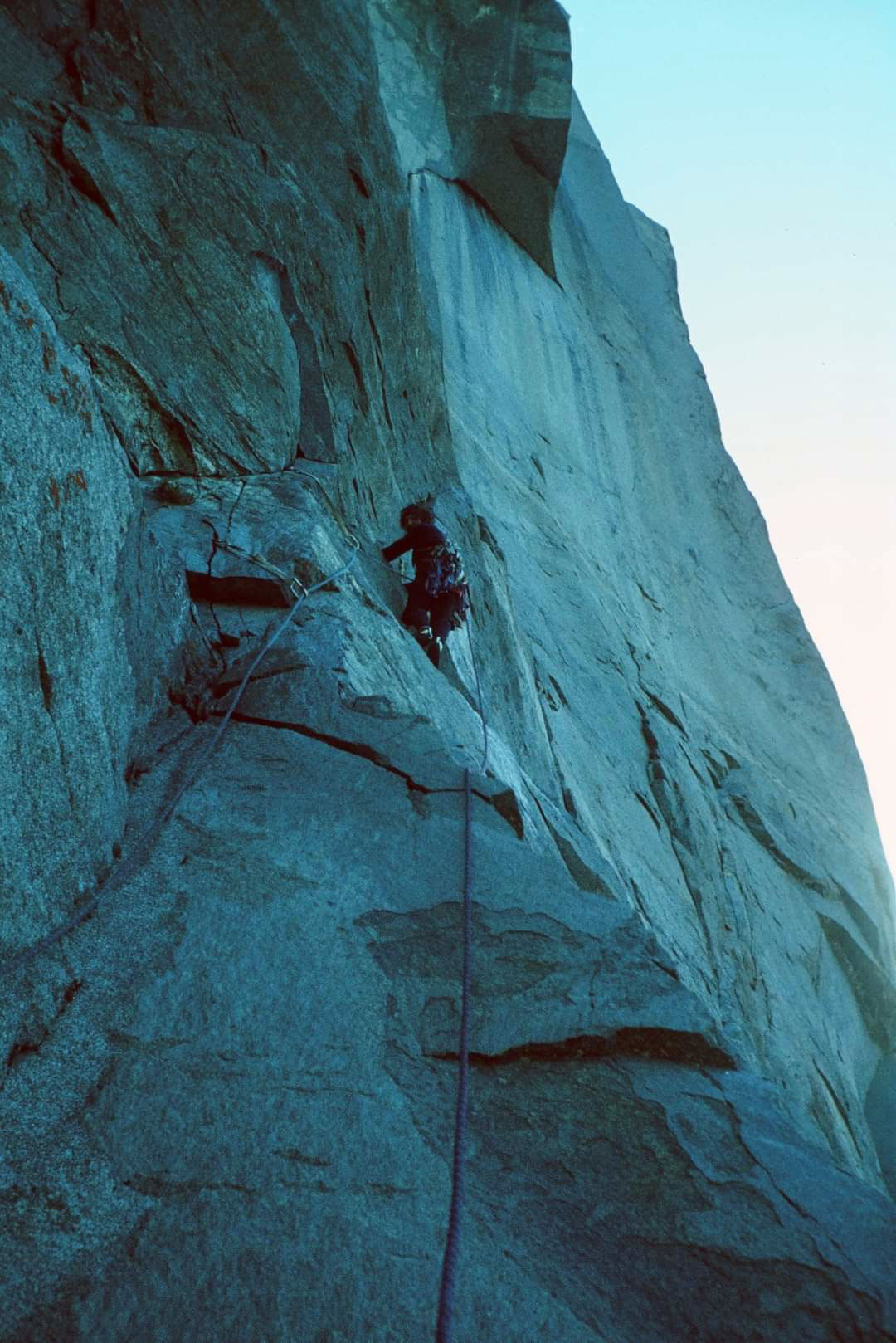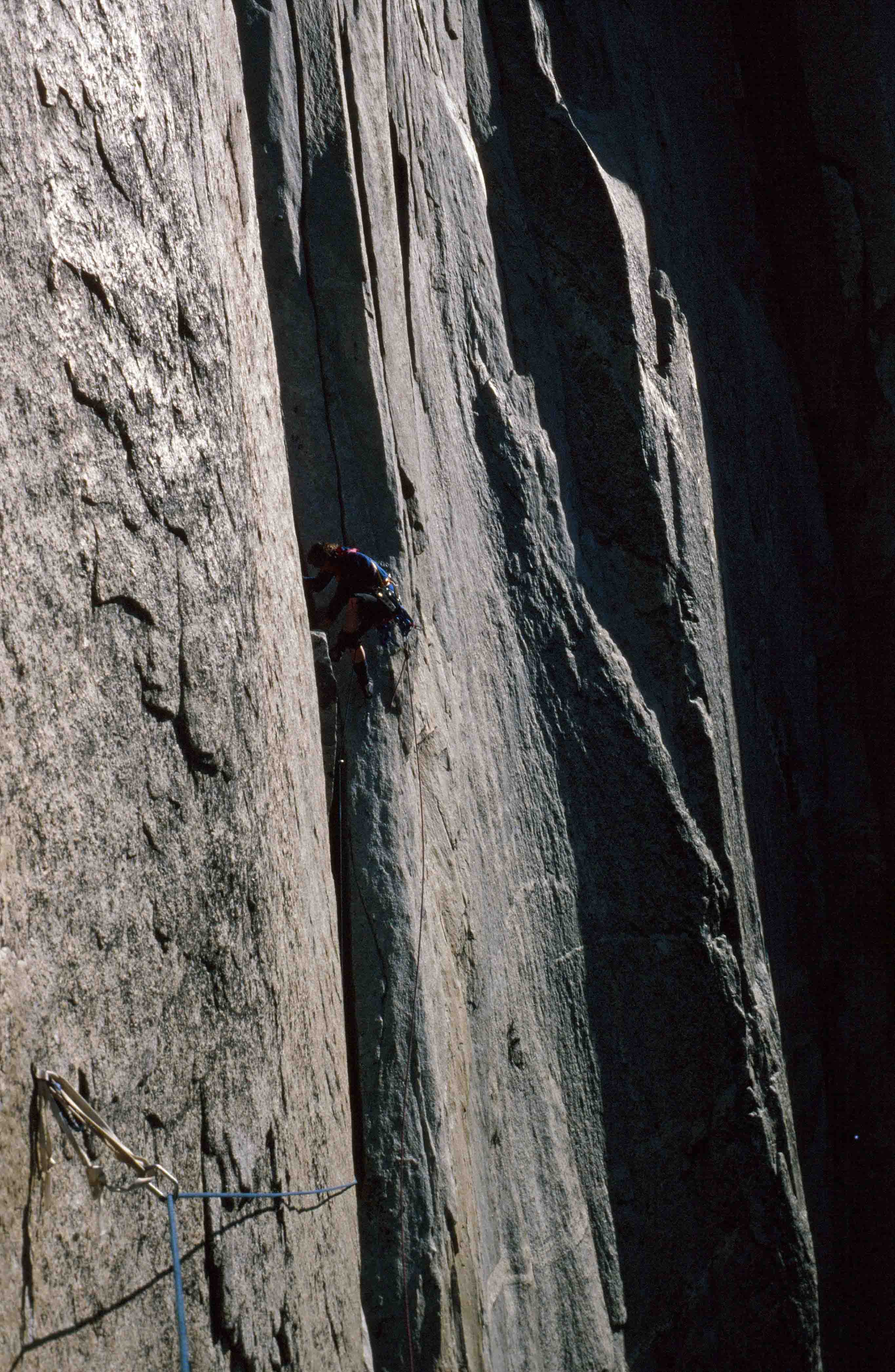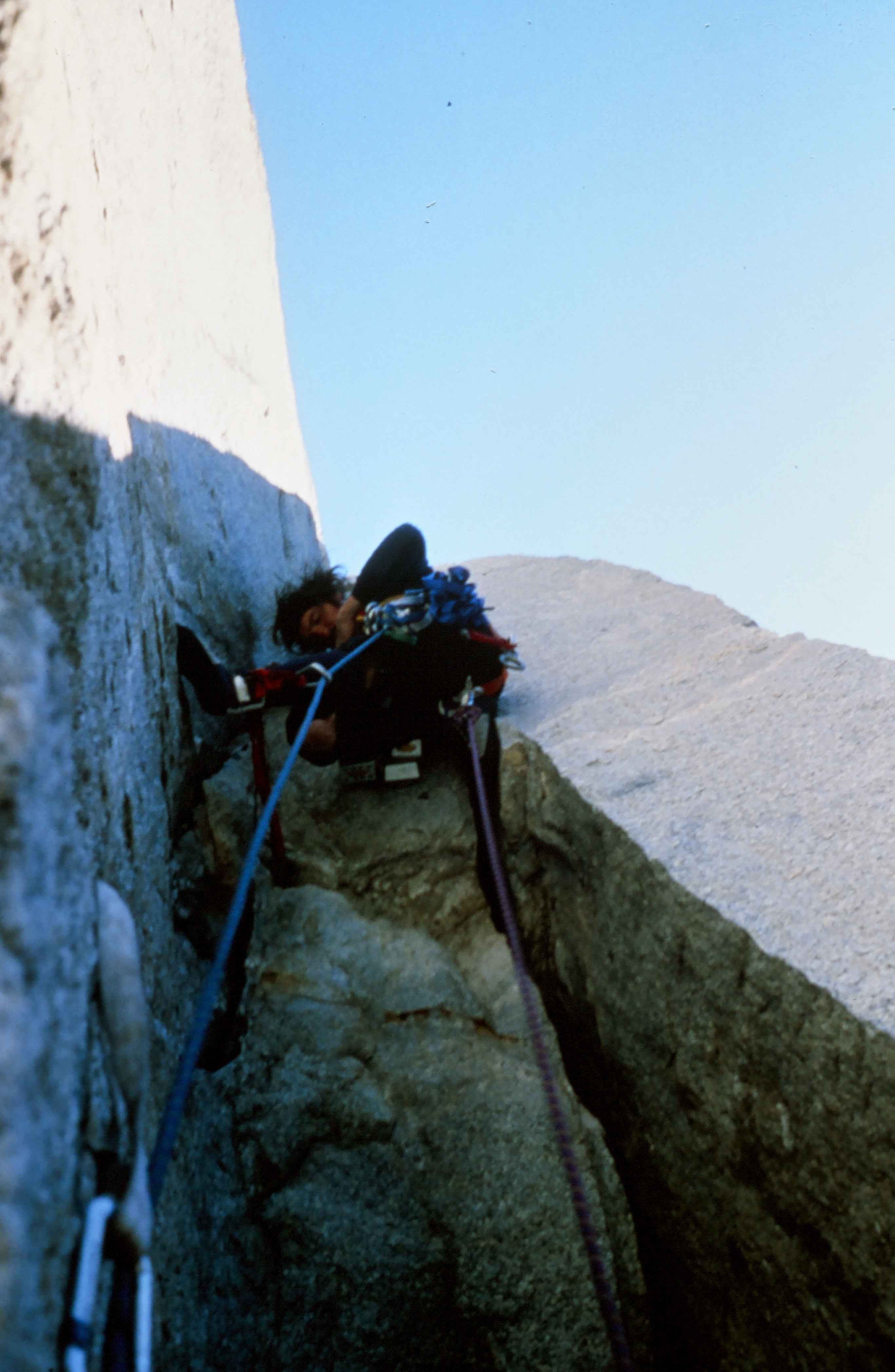 ‘We waren echt volledig slecht voorbereid. We hadden geen haulbags, wisten niets van de touwtechnieken en hadden veel te weinig water. We waren zo stom om op de eerste dag veel water naar beneden te gooien omdat we dachten dat we het niet nodig hadden. Ik klom alles voor. We hadden 3 of 4 dagen nodig om de top te bereiken en het was een fantastische ervaring. Het was ook direct de eerste route die ik deed toen in aankwam in Yosemite. Later in die trip deed ik de noordwestwand op de Half Dome en de Steck-Salathe op de Sentinel.