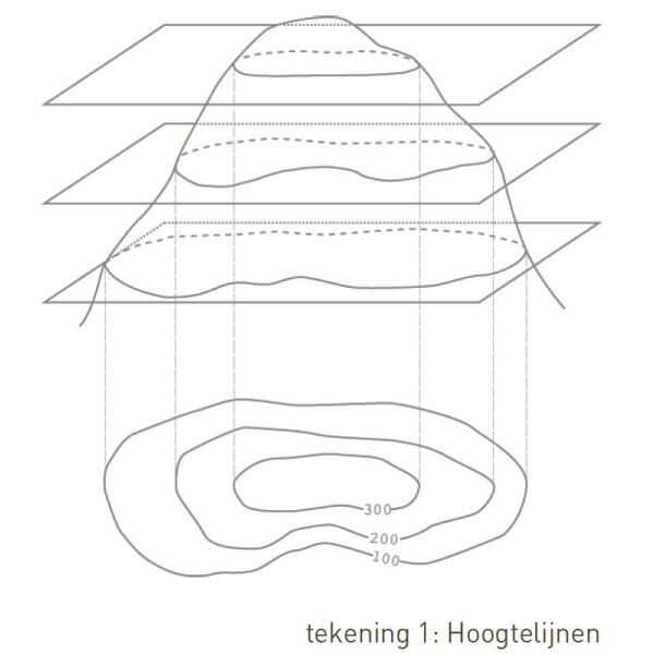 Om op een platte kaart het reliëf en de hoogte te kunnen weergeven, worden hoogtelijnen ingetekend. Ook worden soms schaduwen toegevoegd om een driedimensionaal effect te creëren. Herkenbare punten zoals pasovergangen en bergtoppen hebben een hoogteaanduiding. Hoogtelijnen verbinden punten met dezelfde hoogte, deze staan op de kaart als doorgaande lijnen. Het verloop van de hoogtelijnen schetst de aard van het terrein, waardoor je kammen, geulen, plateaus en steile wanden kunt herkennen. De afstand tussen de hoogtelijnen bepaalt de steilte van het terrein: hoe dichter ze bij elkaar staan, hoe steiler het is. Als je regelmatig met kaart de bergen intrekt, leer je de steilte in te schatten. Op Zwitserse en Oostenrijkse kaarten is de afstand meestal 20 meter, en op de Franse IGN kaarten 10 meter. Maar het kan ook 50 meter zijn. In dit laatste geval zijn hoogteverschillen van minder dan 50 meter niet weergegeven, wat het oriënteren lastig kan maken. Hoeveel de afstand tussen de hoogtelijnen bedraagt, staat meestal in de legenda of op de kaartrand. Elke vijfde hoogtelijn (100-meter-lijn als elke hoogtelijn 20 meter aangeeft) is iets dikker gedrukt en heeft een hoogtegetal. De onderzijde van dit getal wijst altijd naar het dal, zodat je weet wat onder en boven is. Met een gradenboog of een hellingmeter kun je de steilte van het terrein meten.