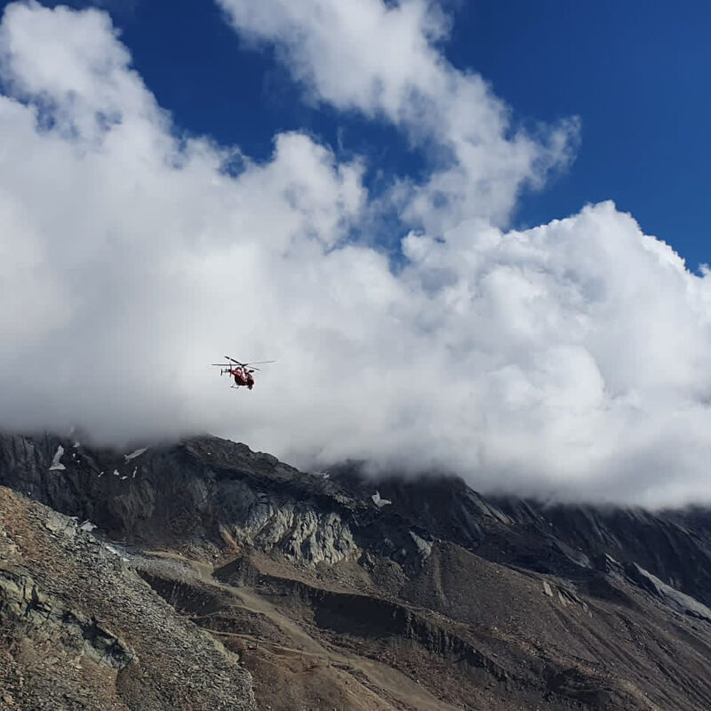 Bij de afdaling gaat het mis. Bij een steil stuk draai ik mij om, om achteruit af te klimmen. Ik denk dat ik een steen beetpak, maar ik grijp mis terwijl ik wel achterover leun. In volle vaart duikel ik achterover, de helling af over de rotsen. Ik probeer mijzelf direct te remmen en kom na een meter of tien gelukkig tot stilstand. Uit alle macht probeer ik mijn hoofd erbij te houden, maar eenmaal tot stilstand gekomen raak ik in paniek. Ik zie niks meer en merk dat ik mijn bewustzijn verlies. Gerlinda is snel bij mij en probeert me erbij te houden. Gelukkig kom ik snel weer bij, maar lopen gaat niet meer. Ik verga van de pijn en er zit niks anders op dan de helikopter te bellen. Die arriveert snel en takelt me op. In het ziekenhuis blijk ik gescheurde enkelbanden te hebben, een gescheurde hamstring en een flinke hersenschudding.
