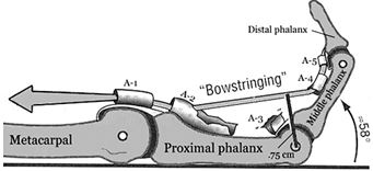 Bij het geheel doorscheuren van meerdere pulleys kunnen de buigpezen van het bot af komen te staan op het moment dat je de vinger buigt en/of belast. Dit heet “bowstringing” (figuur 2).