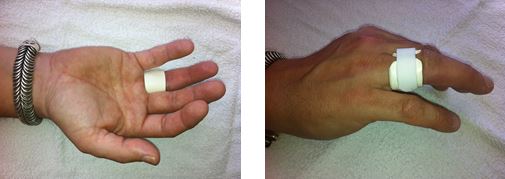 Afhankelijk van de ernst van het letsel kan is het nodig om 14 dagen tape of een rustspalkje (= pulleyring, zie figuur 6 en 7) voor de vinger te gebruiken. De aangeraden tape voor een pulley letsel is de zogenaamde H-tape (zie figuren 8 en 9). Hierbij wordt een strook tape aan beide kanten ingeknipt waarna de twee uiteinden vrij strak aangebracht worden vlak onder en vlak boven het middelste vinger gewricht. Bedenk wel dat tape nooit alle krachten op de pulley kan opvangen. Uit onderzoek is gebleken dat tape slechts ongeveer 13% van de krachten van de A2 pulley opvangt.