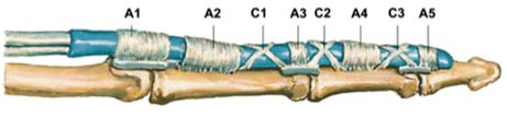 Pulleyletsel of ringbandletsel is waarschijnlijk de meest bekende klimblessure. De pezen die de vingers buigen liggen aan de binnenzijde van de hand. De pulleys houden de buigpezen van de vinger tegen het bot van de vingerkootjes tijdens het buigen. (plaatje) Er zijn 5 rechte pulleys (A1-A5), en 3 gekruiste pulleys voor over de gewrichtjes (C1-C3) (figuur 1). We spreken van een pulley letsel wanneer een of meerdere pulley’s geheel of gedeeltelijk zijn gescheurd. De A2, A3 en A4 pulley van de ringvinger en de middelvinger zijn het meest vaak aangedaan. Dit komt omdat dit de sterkste en meest gebruikte vingers van de hand zijn en deze het zwaarste belast worden.